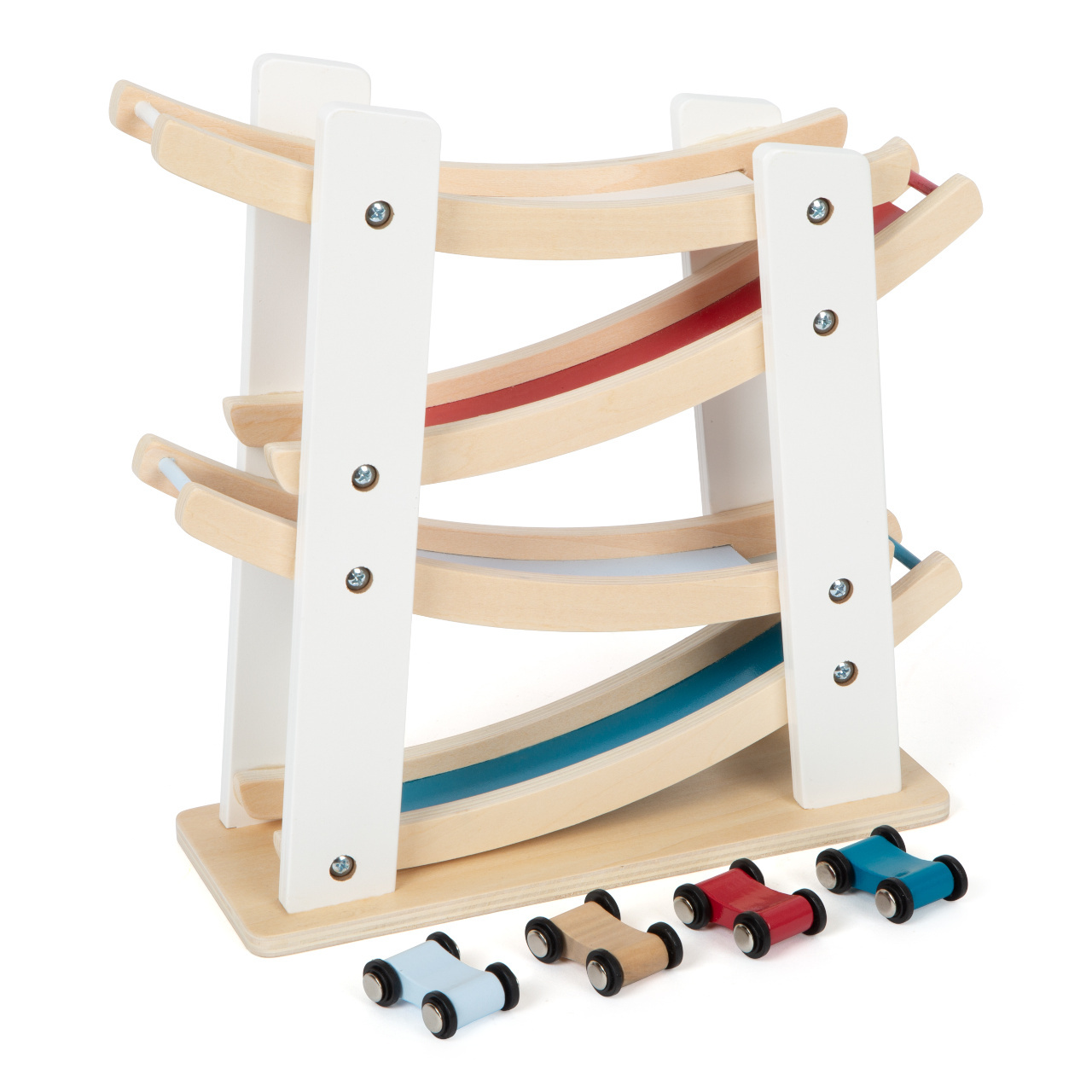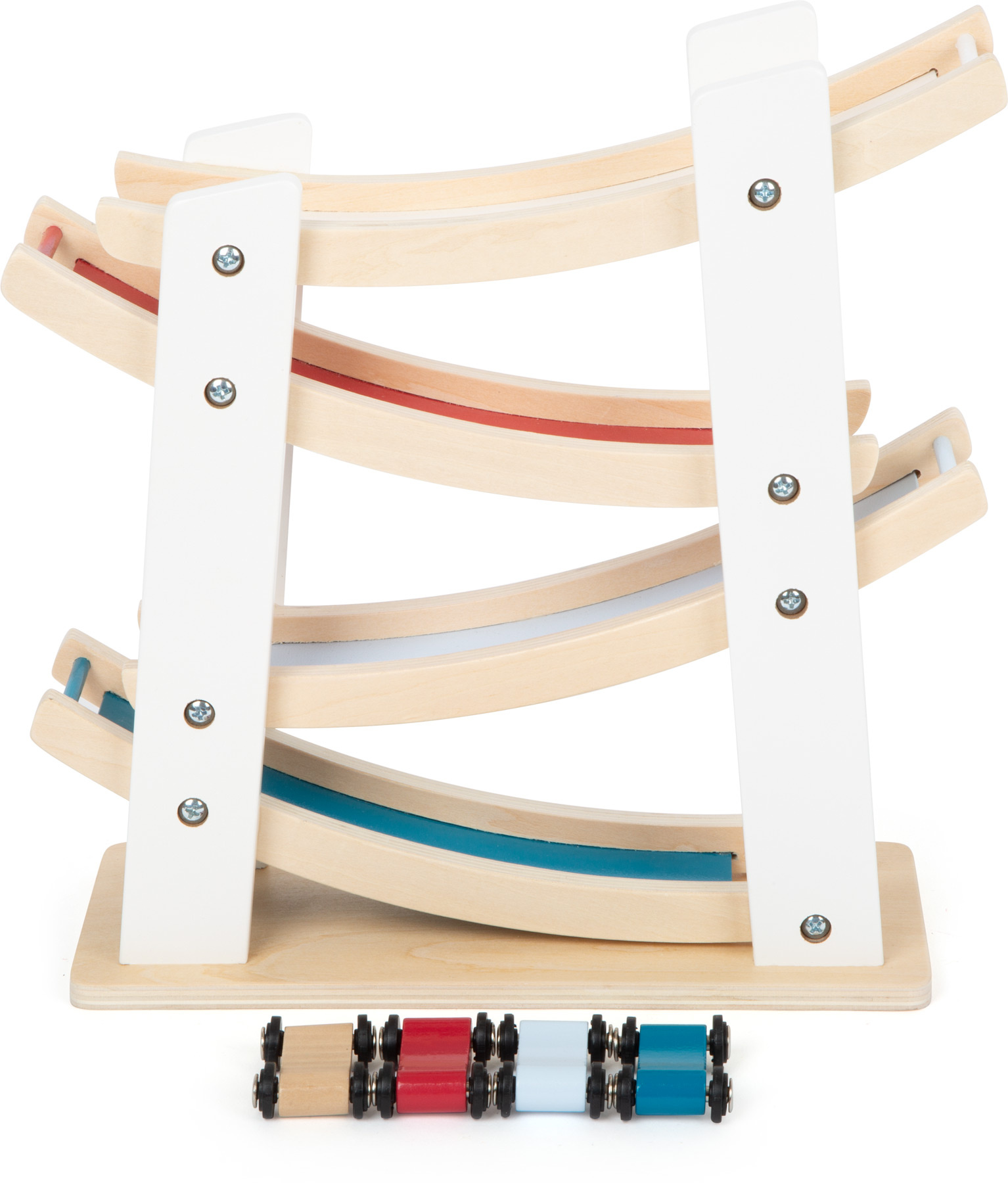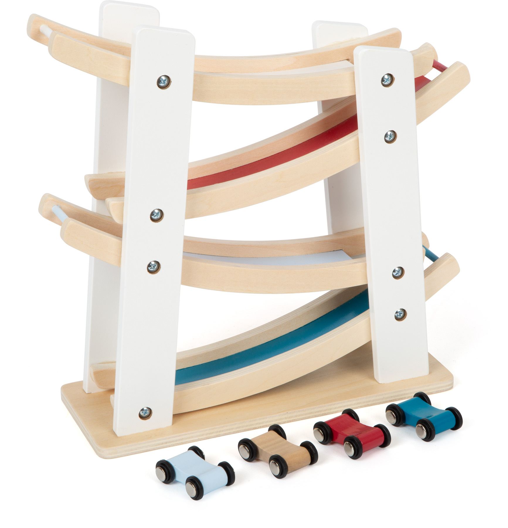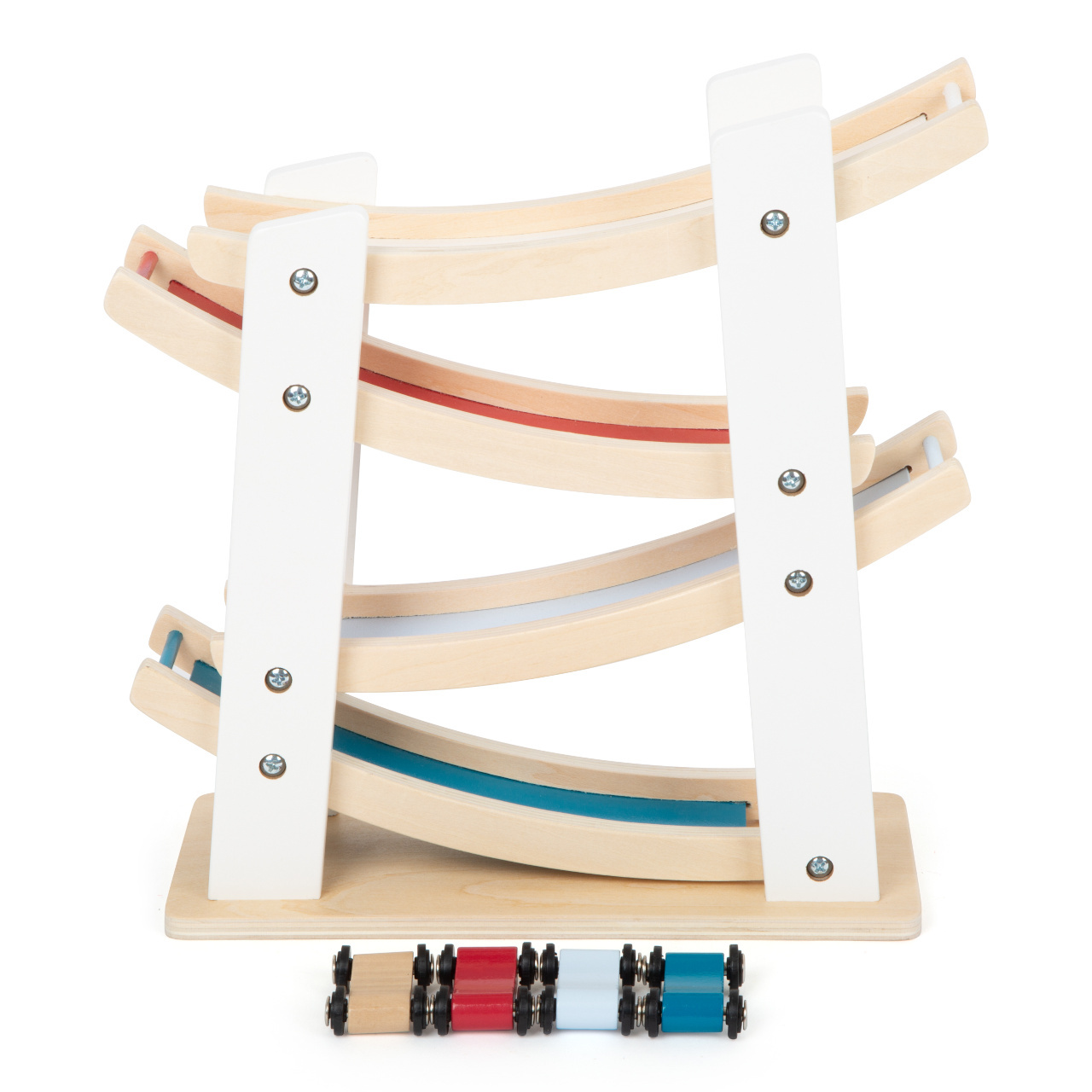 Na značky, připravit, start! Tato dřevěná kaskádová závodní dráha nabízí prostor pro změření rychlosti 4 autíček. Z jednoho patra na druhé, autíčka dělají přemety a jen koukat na ně je zábavné. Dráha je vyrobena z přírodního a bílého dřeva, jedno autíčko je přírodní, zbylé 3 jsou barevné. Hračka rozvíjí motoriku dětí, také koordinaci ruka-oko.