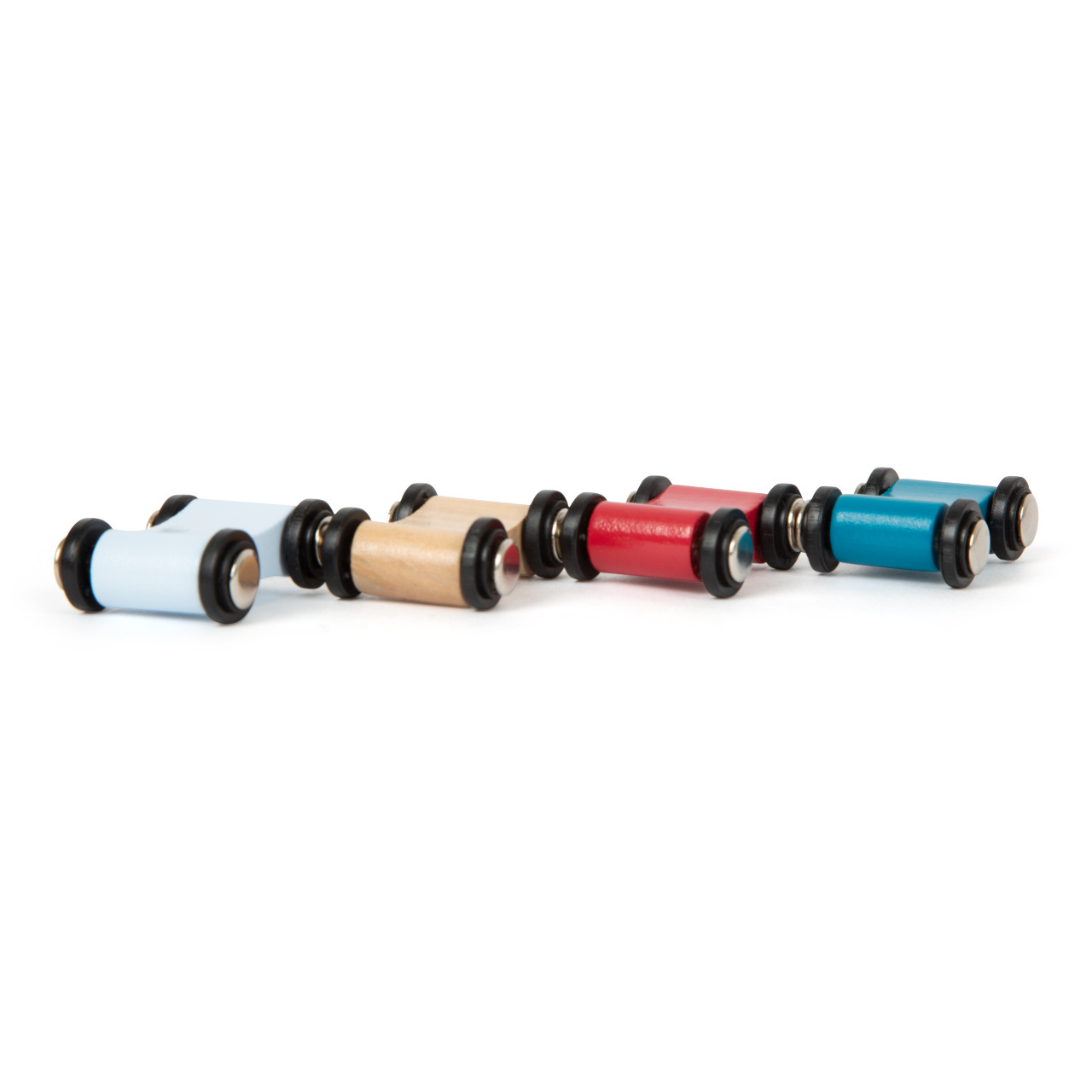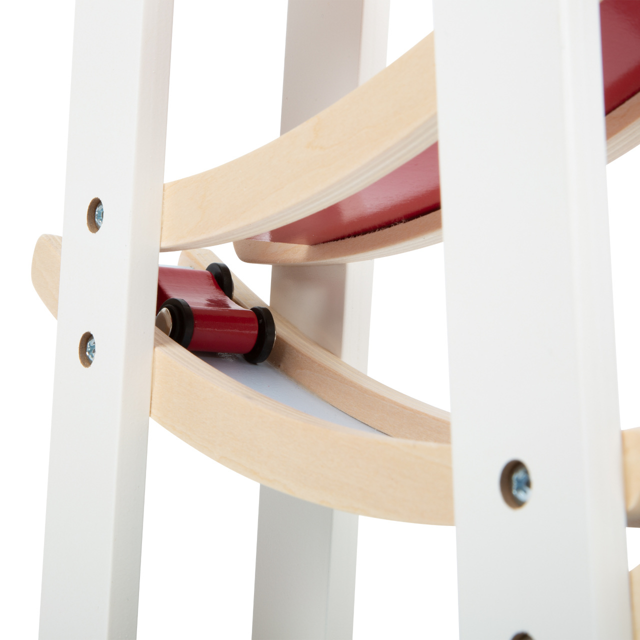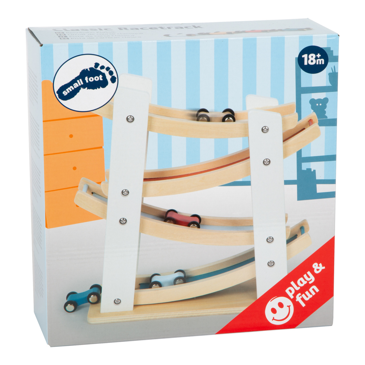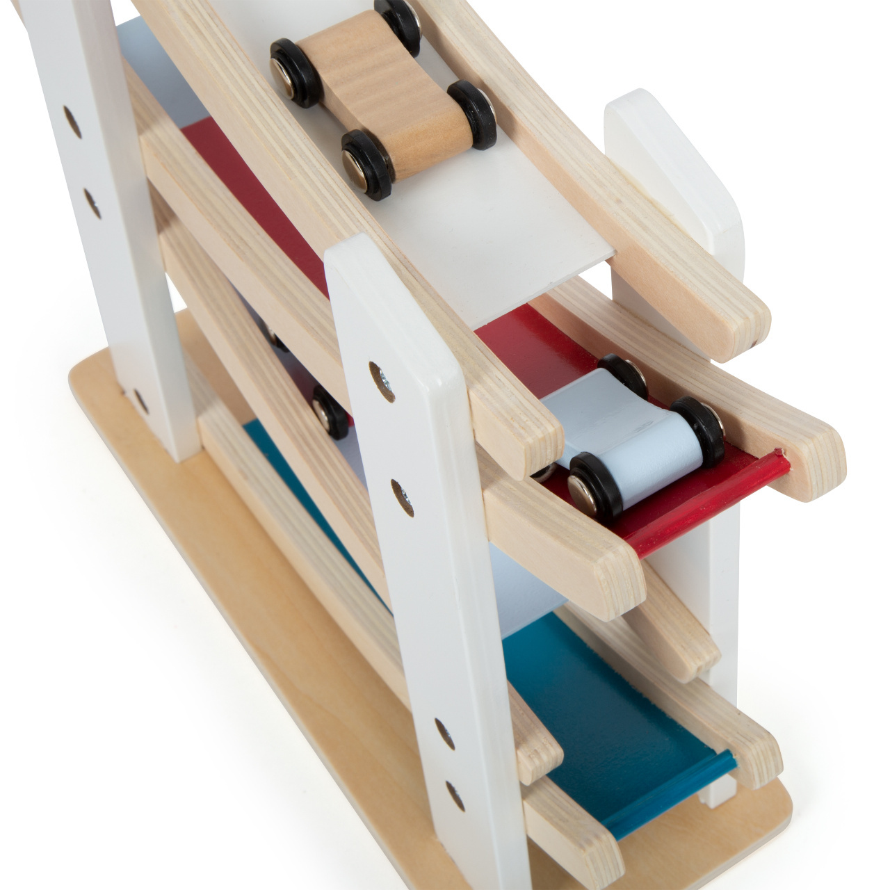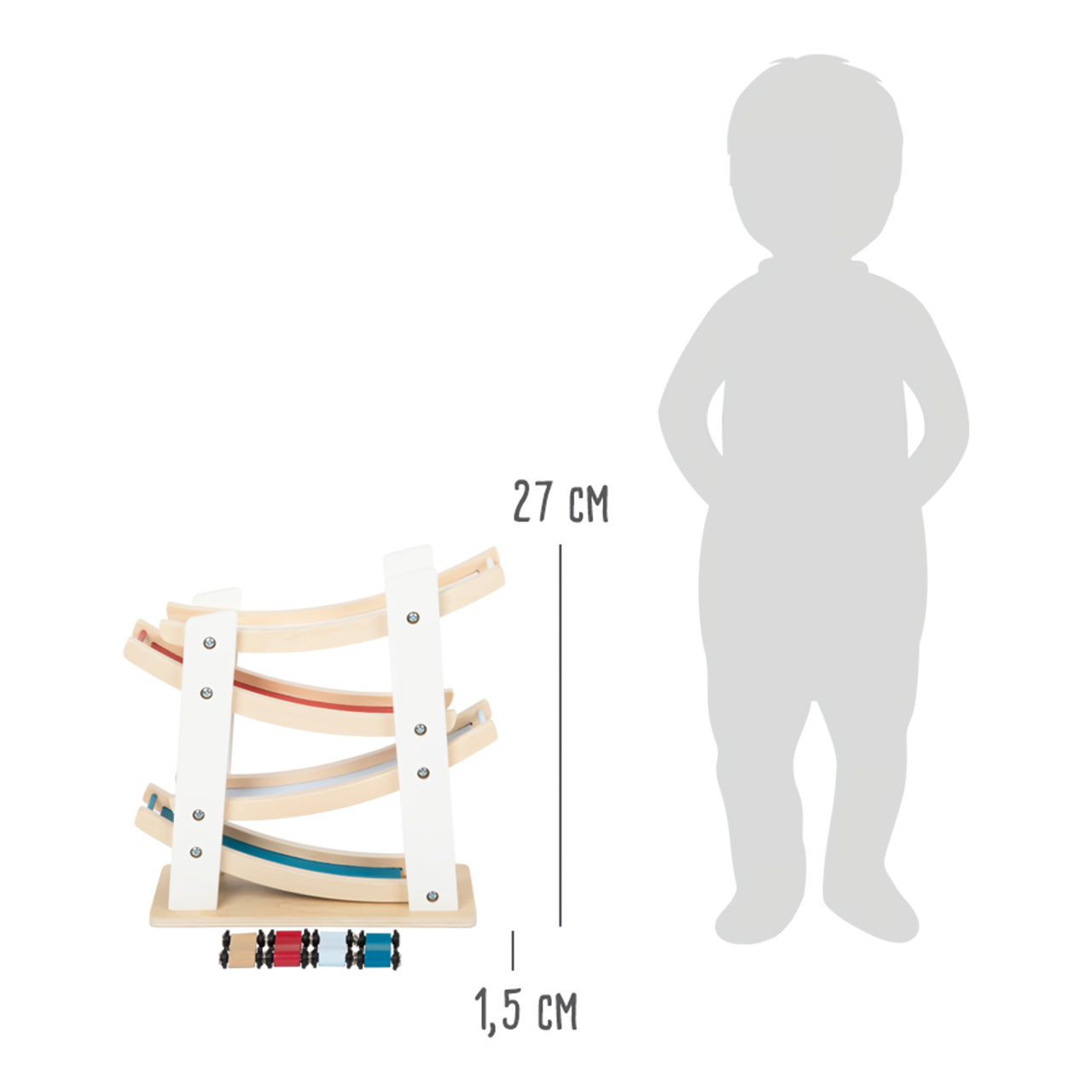 Na značky, připravit, start! Tato dřevěná kaskádová závodní dráha nabízí prostor pro změření rychlosti 4 autíček. Z jednoho patra na druhé, autíčka dělají přemety a jen koukat na ně je zábavné. Dráha je vyrobena z přírodního a bílého dřeva, jedno autíčko je přírodní, zbylé 3 jsou barevné. Hračka rozvíjí motoriku dětí, také koordinaci ruka-oko.