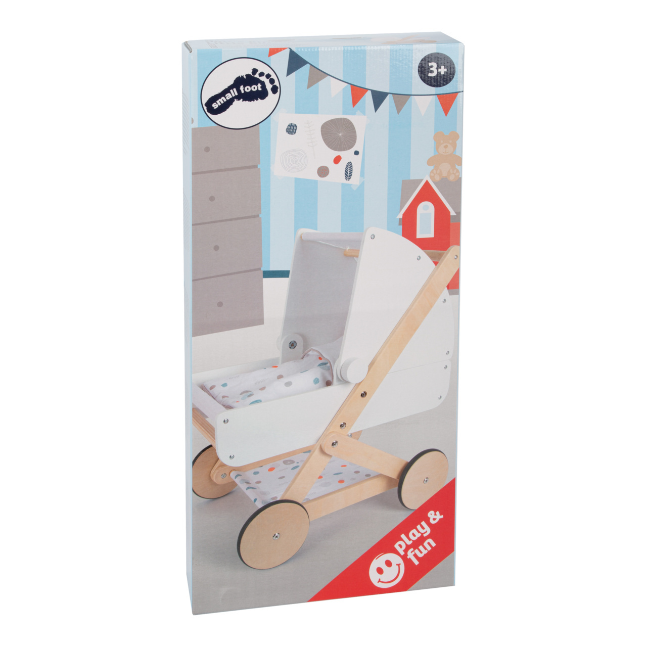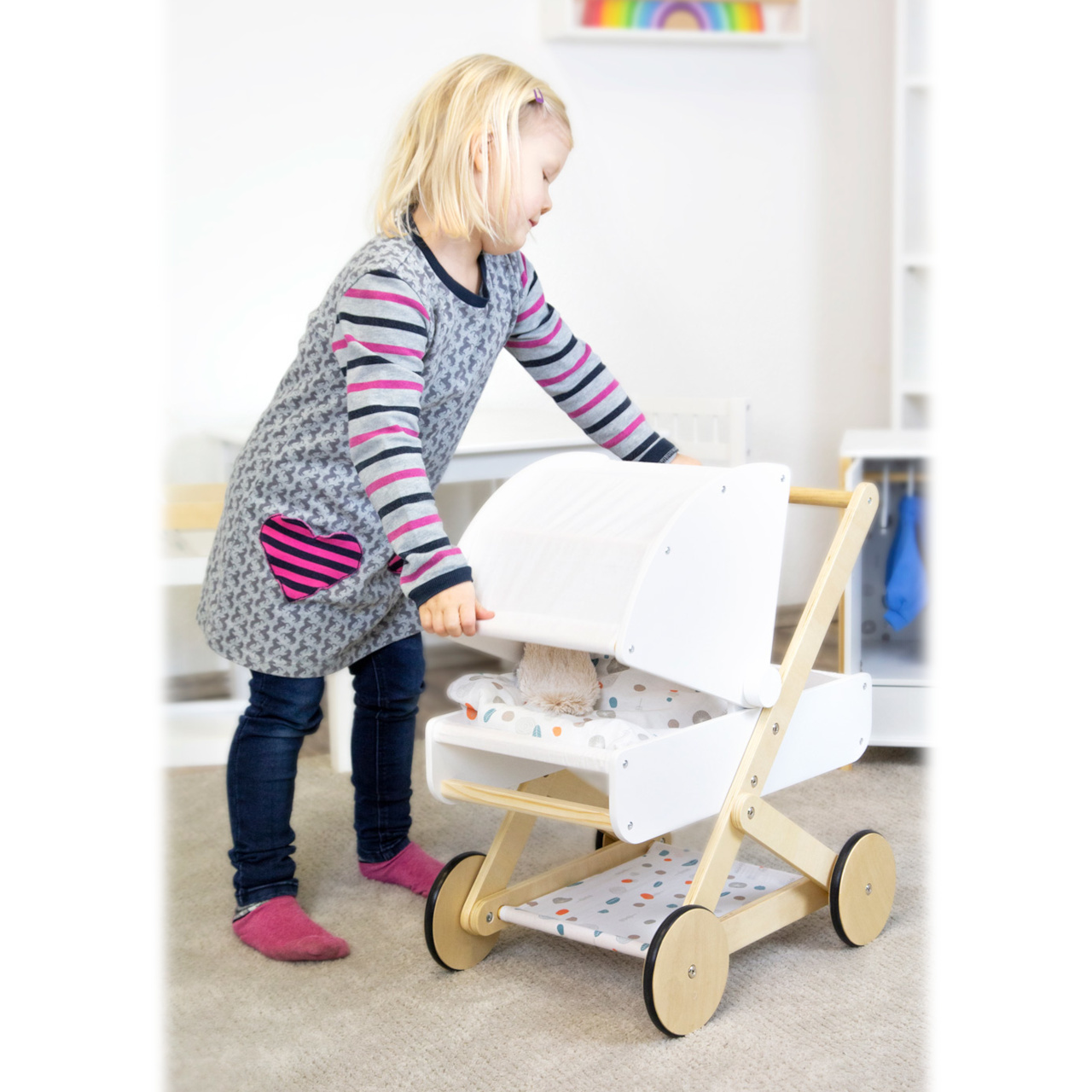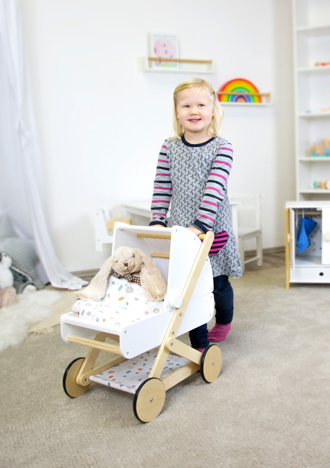 Pro panenky, plyšáky a jejich kamarády jen to nejlepší! Tento moderní kočárek pro panenky na vás udělá dojem svým jemným, lineárním skandinávským designem a také úložným prostorem pod lehátkem. Díky odklápěcí stříšce mohou panenky a plyšáci z kočárku koukat dopředu nebo dozadu. Oboustranné a genderově neutrální povlečení s peřinou nadměrné velikosti zajistí, že panenky a plyšáci do 46 cm budou v pohodlí. Kočárek má tichá pogumovaná kolečka. Moderní kočár s prvky z přírodního dřeva, s omyvatelným textilem jen čeká kdo se v něm sveze! Je velmi stabilní i při své nízké váze, hodí se do každého pokoje a to díky svému neutrálnímu designu.