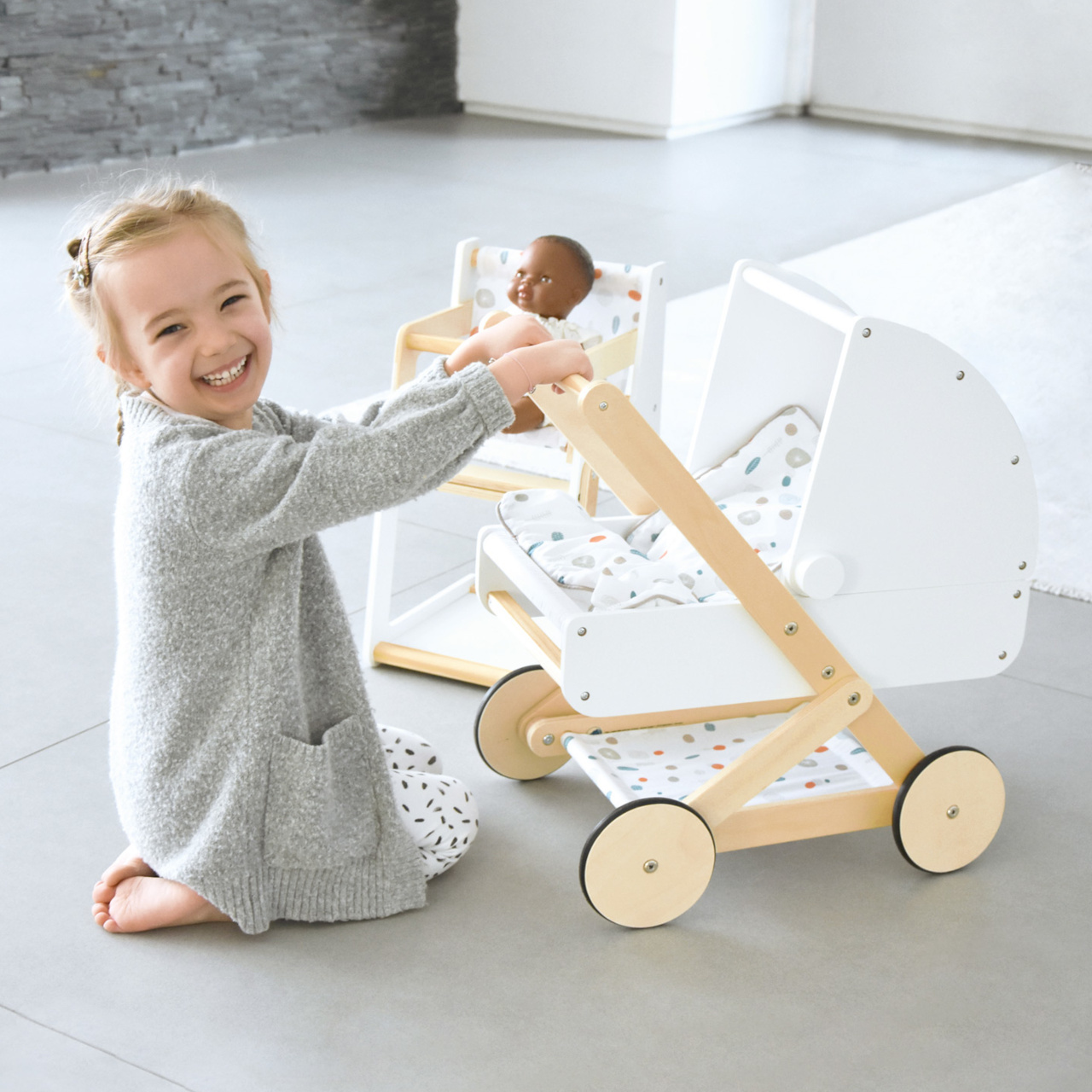Řada atraktivního příslušenství pro panenky Little Button nabízí pestrou paletu výrobků, od kočárku přes jídelní židličku až po skříň. Zákazníky snadno zaujmou jednotným funkčním a decentním designem využívajícím přímé linie a střídmé neutrální barvy. Díky tomu spolu mohou vytvořit ucelené harmonické soupravy, které vkusně doplní moderní interiér. Důmyslná konstrukce a kvalitní zpracování pomáhají zajistit vysokou stabilitu, bezpečnost a dlouhou životnost. Založte s jejich pomocí stylový koutek pro panenky, kde mohou Vaše děti rozvíjet svou fantazii a pečovatelské dovednosti.