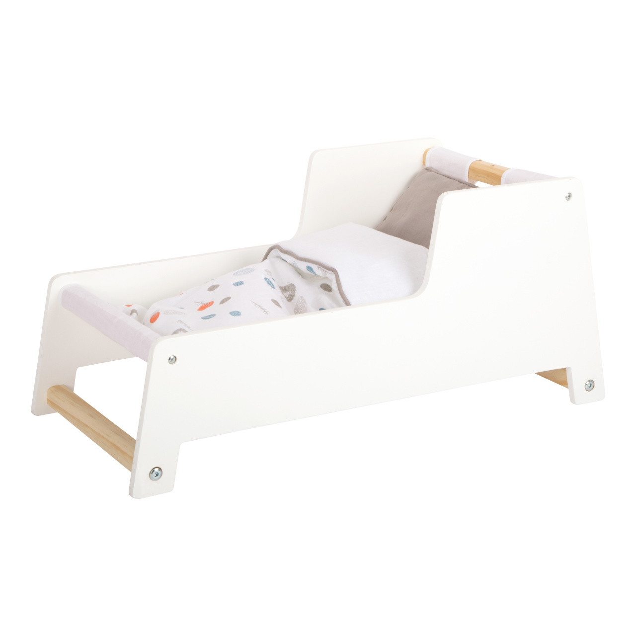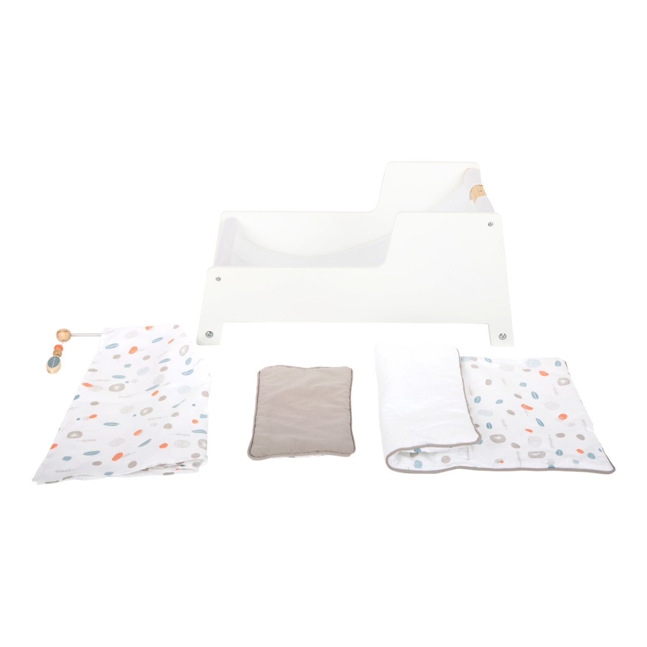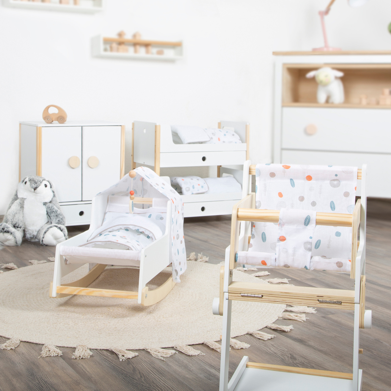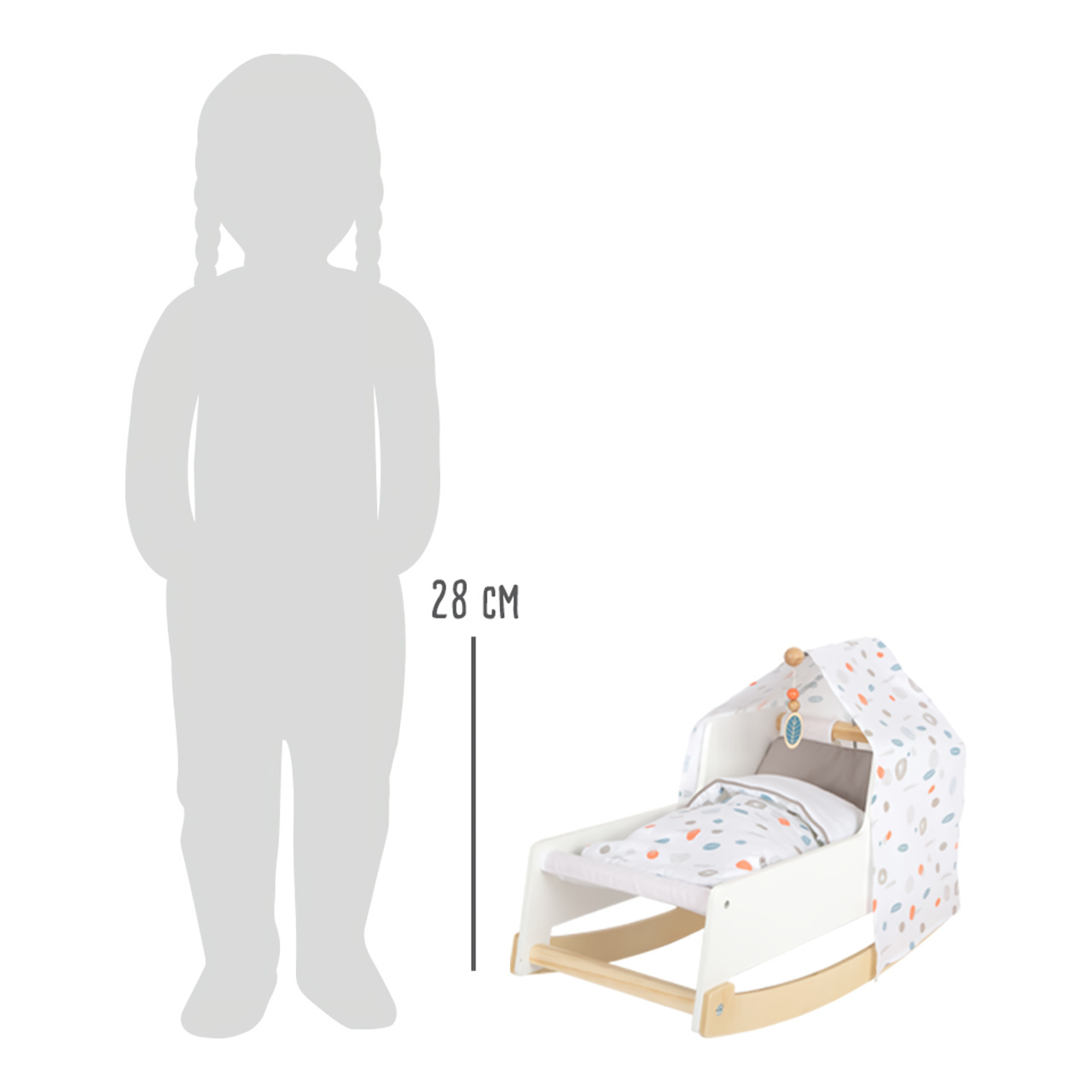 Panenky také potřebují spát! Tato moderní kolébka ve skandinávském designu je genderově neutrální, má oboustranné povlečení a pod velkou peřinou mohou spát panenky a plyšáci do 46 cm. Spodní část tzv. lyže kolébky jsou oddělitelné, stejně jako baldachýn. Vysoce kvalitní, stabilní konstrukce, zaoblené hrany, viditelně ze dřeva... Perfektní hračka do každého dětského pokoje.