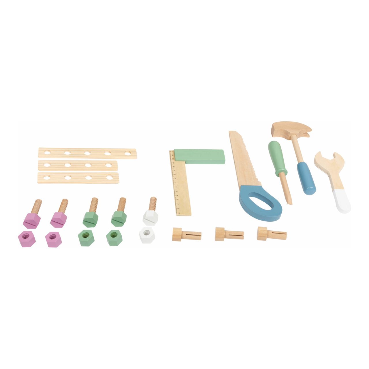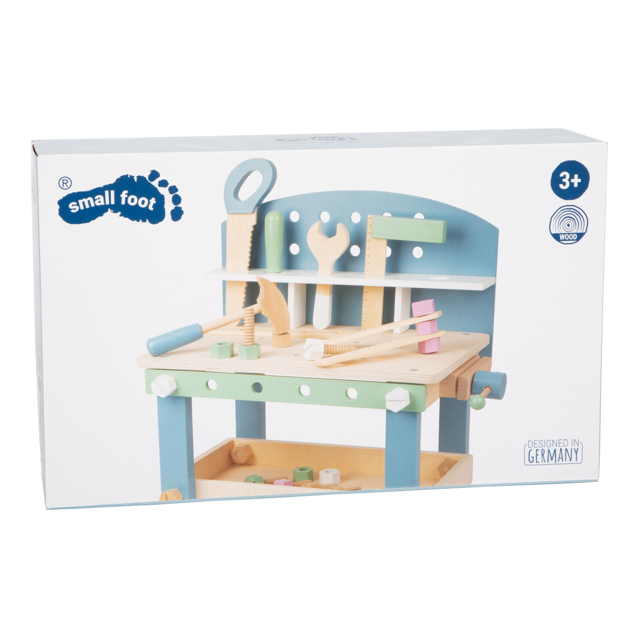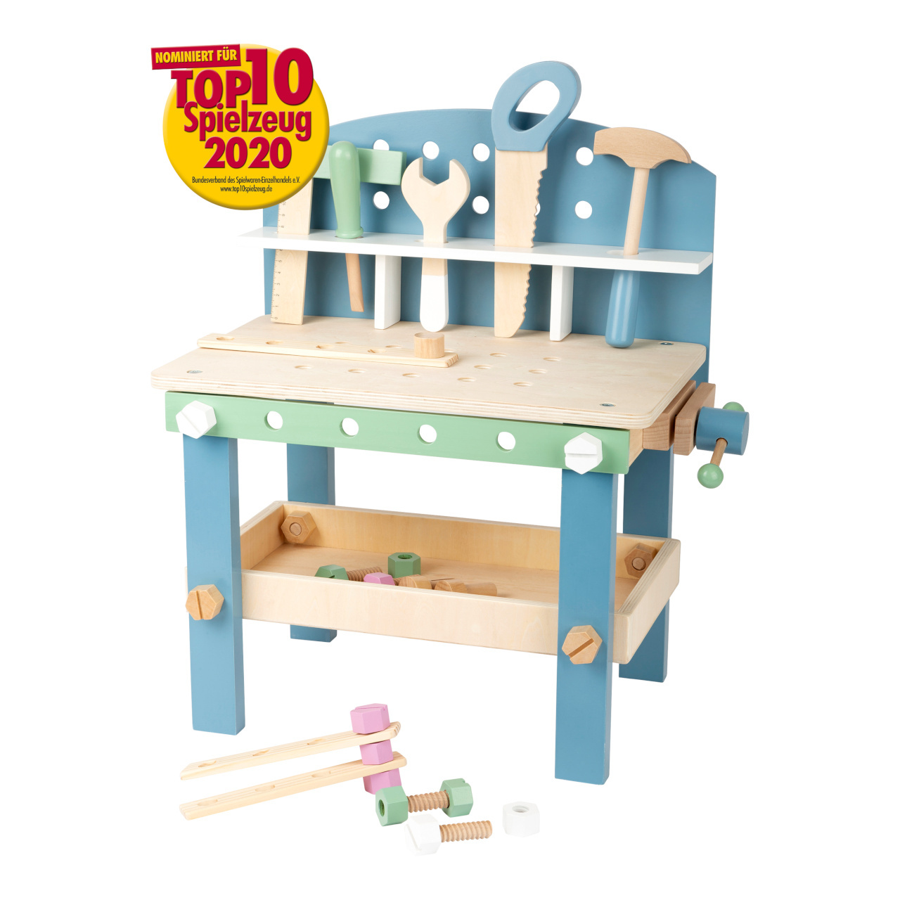 Jemné pastelové barvy, pěkné tvary, přírodní materiál – to je severský design! S tímto dřevěným ponkem se mohou děti při hře naučit manuální zručnosti. Obsahuje 21 doplňků – 5 šroubů, 5 matek, 3 hřebíky, 5 kusů nářadí a 3 pláty s dírami pro trénování jemné motoriky. Děti mohou pomoci při složení ponku a dokázat tak, že mají talent pro manuální práci. Nářadí a doplňky mohou být uloženy do bezpečné poličky. Ponk se skandinávským designem se bude hodit do každého domova. Je to skvělá hračka pro kluky i holky.
