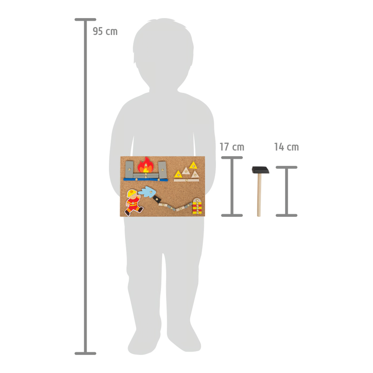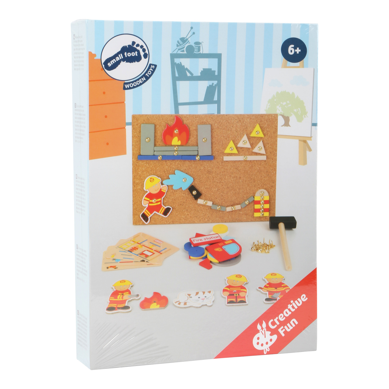 S touto hrou si může každé dítě vyrobit svou vlastní hasičskou stanici na nástěnné desce. Dřevěné a kartonové dílky skládačky mají předvrtané otvory, malé hřebíčky lze snadno zatlouct do korkové desky dřevěným kladívkem. Balení obsahuje také čtyři oboustranně potištěné karty s návrhy motivů.