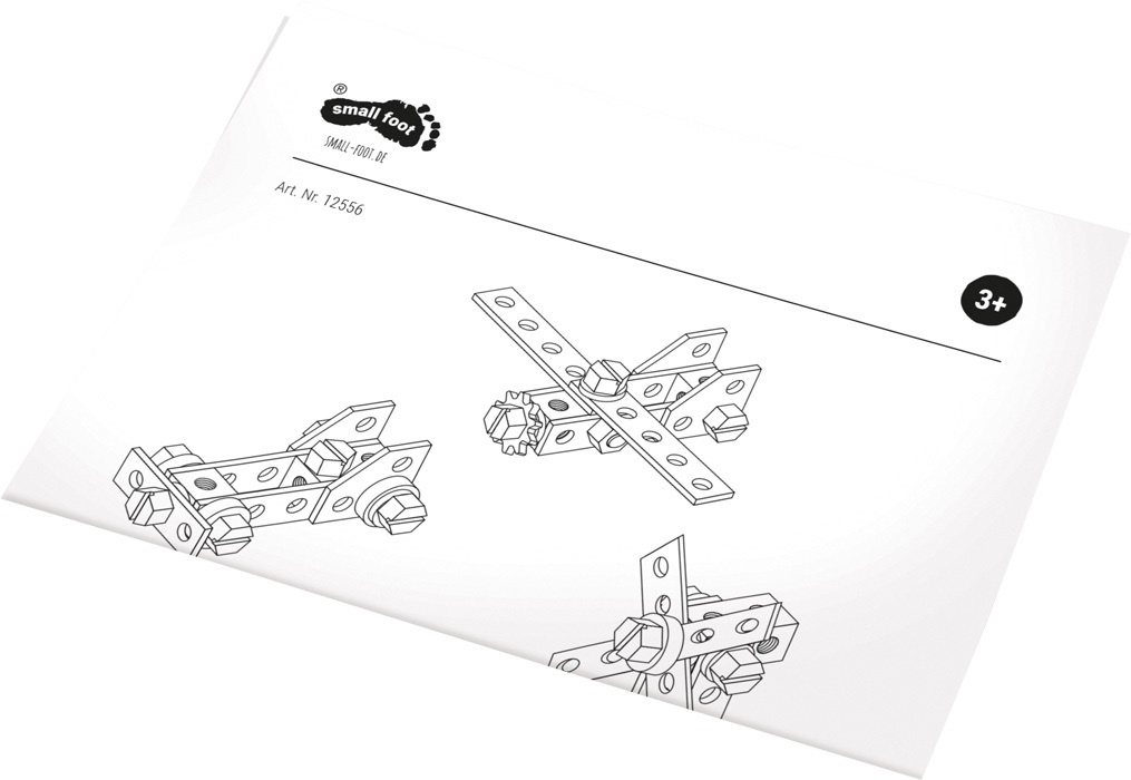 Sada obsahuje: kufřík, kladivo, klíč, šroubovák, kleště, pilu, 11 šroubů, 12 matic, 2 obdélníkové perforované destičky, 2 malé perforované destičky, 4 středně velké perforované destičky, 2 perforované destičky ve tvaru kosočtverce, 4 silné podložky, 4 tenké podložky, 2 ozubená kola.