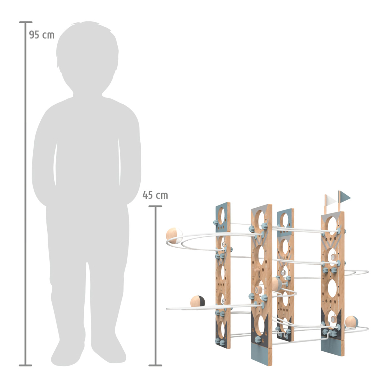Stavění a kombinování dílů kuličkové dráhy nebylo nikdy snazší, a to díky modulární konstrukci využívající kovové a plastové spojovací prvky, jejichž pomocí lze dráhu rozšiřovat a v případě potřeby i prakticky uklidit. Do klikaté dráhy lze rozestavět překážky v podobě zarážek a jemně zvonících rolniček. Hračka využívá robustních základních dílů z odolné překližky a kuliček z masivního dřeva, které jsou vyvedeny ve skandinávských a přírodních odstínech, stylově tak doplní dětský pokoj. Dodáváno s detailním návodem k sestavení.