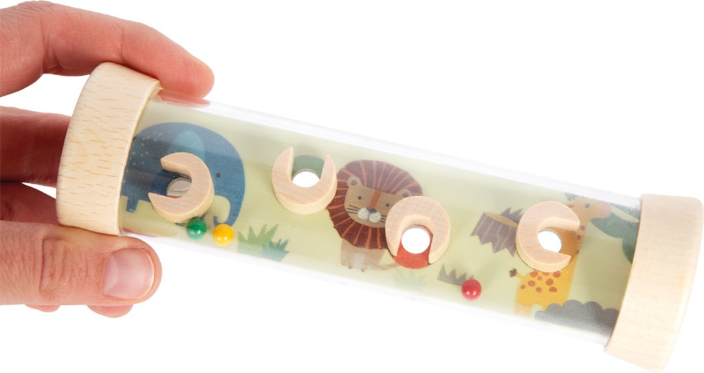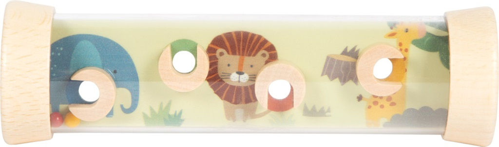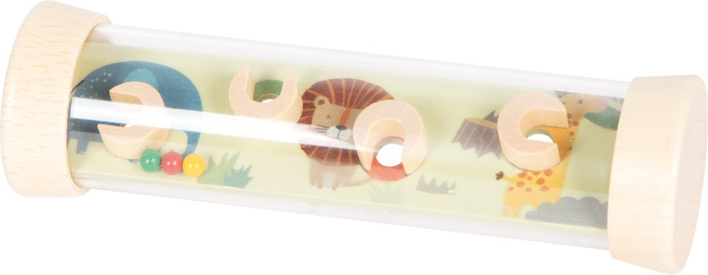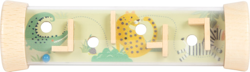 Tento oboustranný labyrint zaujme nejen děti ale i dospělé. Není to jen zábavná hra, ale také chrastítko. Kuličkový labyrint v robustní průhledné trubici rozvíjí motorické dovednosti dětí. A nebude to jednoduché umístit zároveň všechny 4 barevné dřevěné kuličky, které se uvnitř kutálejí, do otvorů. Na obou stranách labyrintu se děti setkají s divokými zvířátky, jako jsou krokodýl, zebra, lev, žirafa a další. Barevné provedení v jemných barvách v kombinaci se vzhledem přírodního dřeva je pro děti atraktivní a stimuluje jejich představivost. Velikost labyrintu je vhodná pro dětské ručičky. Trénuje obratnost, soustředění a trpělivost a zabaví děti nejen doma ale i na cestách. Je také vhodný jako dárek.