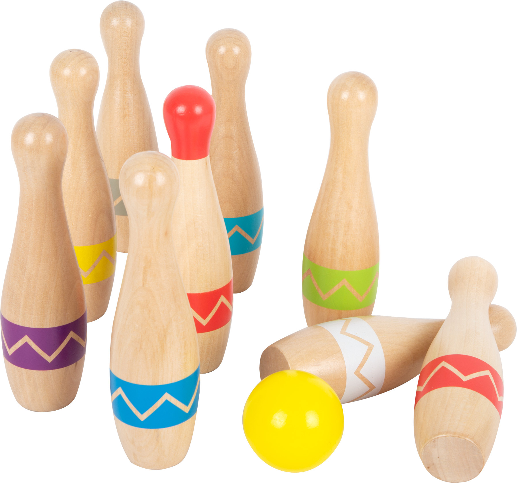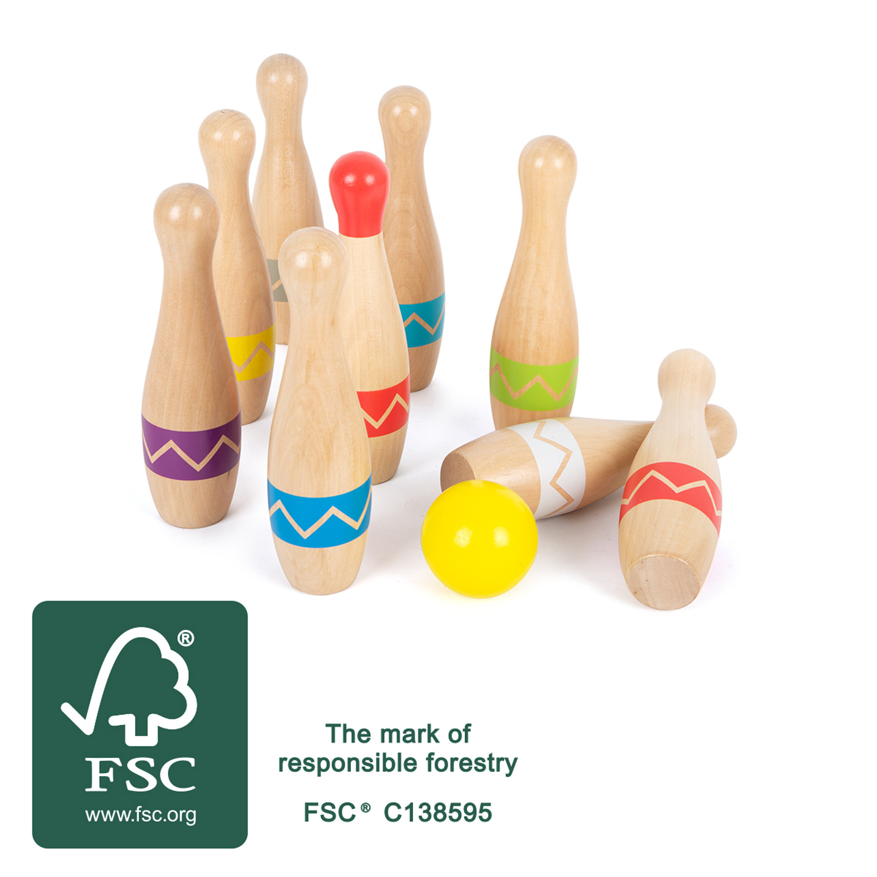 Kdo shodí všech devět kuželek? Tento set je vyroben ze 100% certifikovaného FSC® dřeva, zábavná hra pro všechny věkové kategorie! Devět kuželek je vyrobeno z pevného dřeva v moderním „Active“ designu, dvě dřevěné koule mají velikost tak akorát pro děti. Kuželky jsou vhodné do vnitřních i venkovních prostor. Kuželkový set je uložen v textilním pytlíku s poutky, můžete si jej tak vzít kamkoliv s sebou. Díky moderním barevným potiskům kuželky jednoduše uvidíte i v trávě a z větší dálky. Kdo má nejpřesnější mušku?