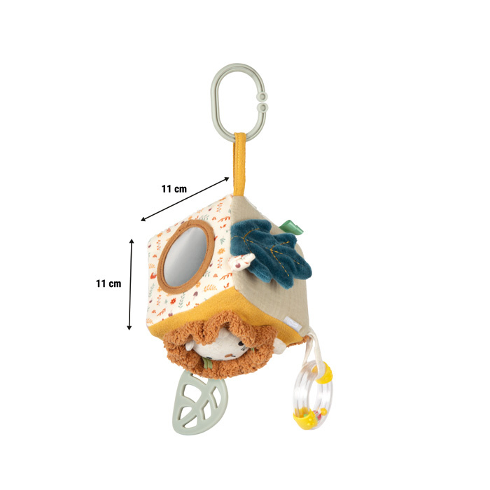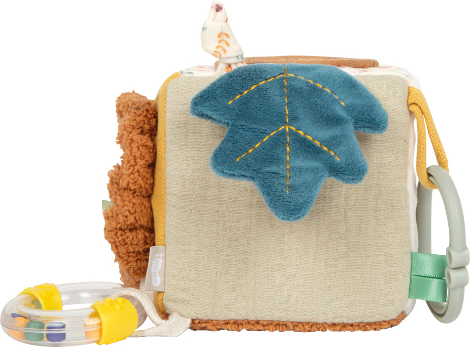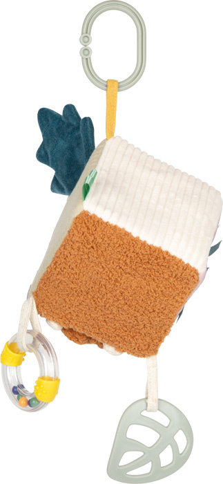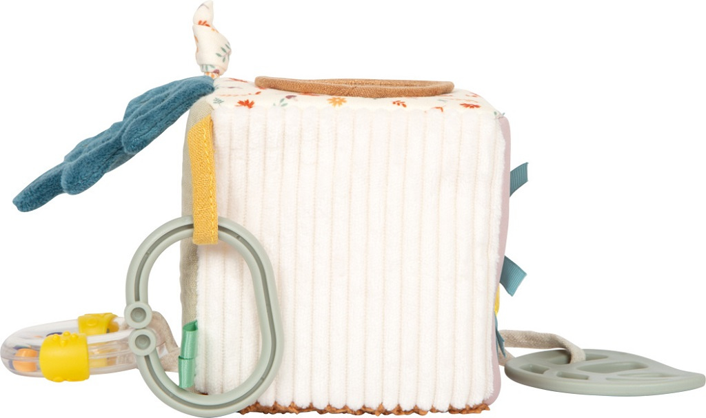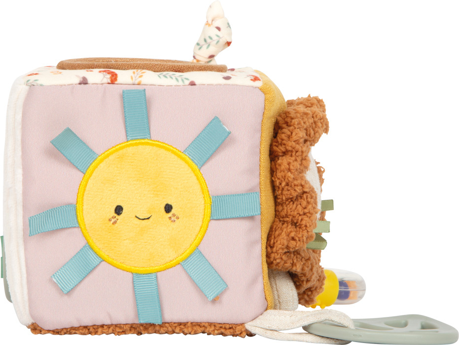Tato měkká hrací kostka je všestrannou hračkou pro miminka, která nabízí spoustu podnětů ke hře i objevování. Šusticí prvky, zabudovaný zvoneček, chrastítko i kousátko vytvářejí rozmanité zvuky a hravou formou podporují raný vývoj dítěte. Různorodé textury látek stimulují hmat, zatímco uchopování, mačkání a otáčení jednotlivých stran kostky přirozeně rozvíjí jemnou motoriku. Díky praktickému poutku lze kostku snadno připevnit na kočárek, autosedačku nebo hrazdičku, takže je vždy po ruce. Kompaktní a měkce polstrovaný tvar činí kostku bezpečnou a příjemnou na mazlení i pro ty nejmenší. Veselý motiv lvíčka, roztomilý design a harmonické barvy z ní dělají oblíbenou hračku každého miminka. Skvěle se hodí jako doplněk k dalším produktům z kolekce Little Lion a je ideálním dárkem k narození dítěte nebo ke křtu.
