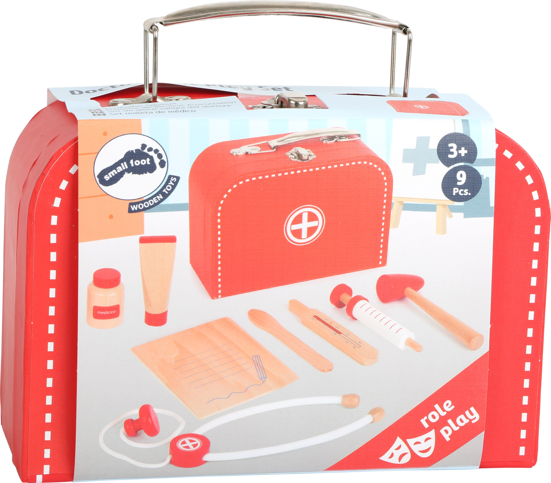 O zdraví panenek a plyšáků bude s doktorským kufříkem dobře postaráno! Obsahuje všechny důležité nástroje a pomůcky. Injekční stříkačka je vybavena pohyblivým pístem, aby hra byla uvěřitelná a děti se mohly cítit jako skuteční lékaři. Pevný a skladný kufřík je vybaven odolným kovovým zavíráním a uchem. Všechny součásti jsou robustní, vyrobené z masivního dřeva, opatřené zaoblenými hranami a kvalitní, hladkou povrchovou úpravou.