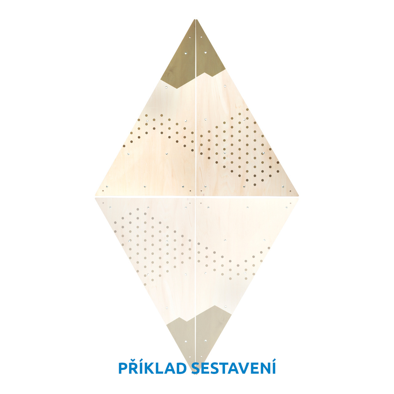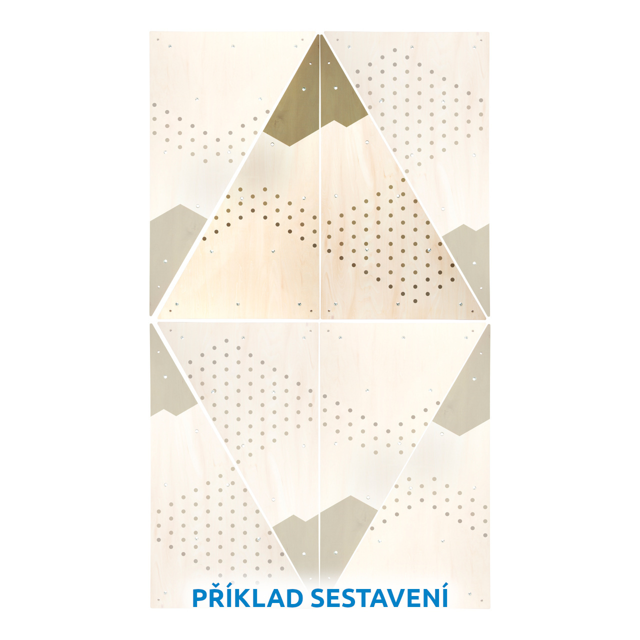 Modulární lezecká stěna do dětského pokoje! Skládá se ze 2 trojúhelníků, každý z nich má 9 předvrtaných otvorů, do kterých padne 6 robustních plastových chytů, které najdete v balení. Chyty můžete umístit kam chcete, v jakémkoliv úhlu, který je vhodný vzhledem k schopnostem dětí. K instalaci nepotřebujete nářadí, hračka je vybavena také ochranou stěny.