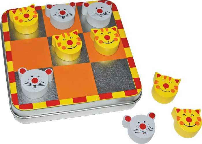 Piškvorky v designu kočky a myši. V kovové krabičce jsou magnetické hrací kameny dobře uložené. Bez ohledu na to, jak rychlá může být jízda v autě, magnetické hrací figurky stojí bezpečně na herním plánu, který zároveň slouží jako úložný box. Hra podporuje logické myšlení a je vhodná na cesty.