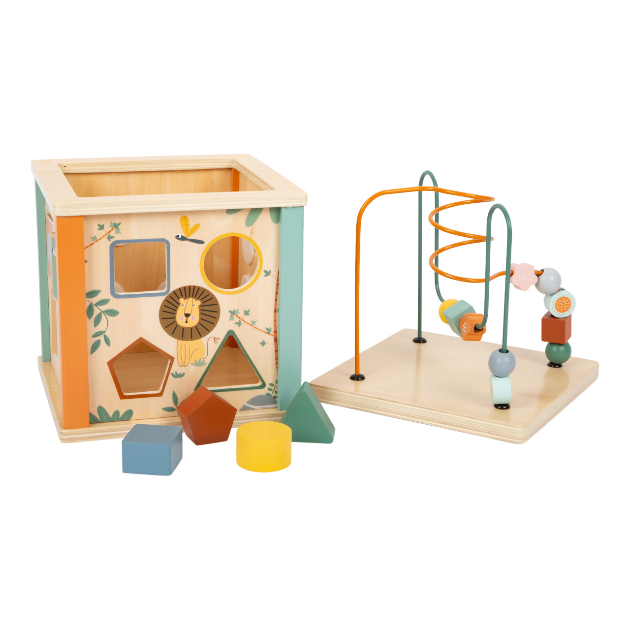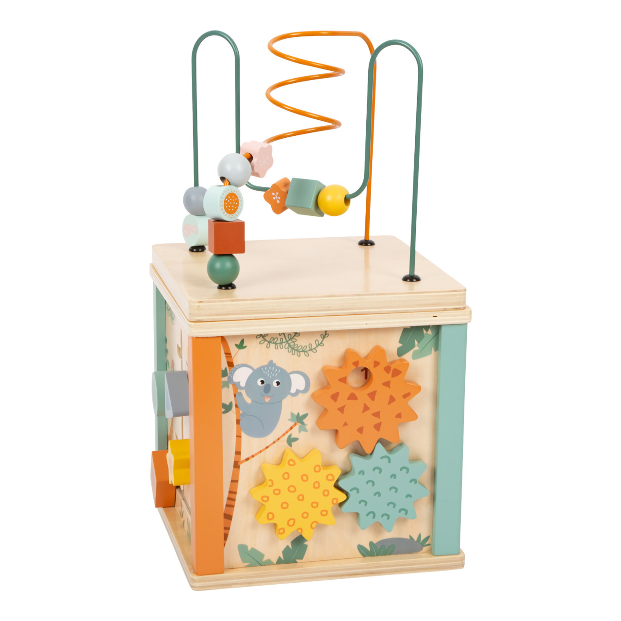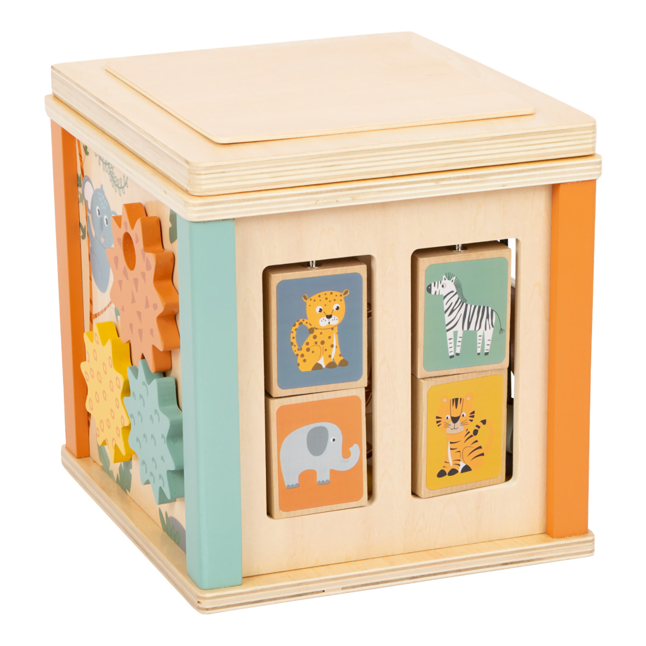 Prozkoumejte džungli motorických aktivit. Kostka je vyvedena v originálních a atraktivních safari barvách a motivech, s mnoha roztomilými zvířátky. Po stranách nabízí posuvné i korálkové bludiště, otočné kameny, ozubená kolečka a vkládačku. Děti s jejich pomocí mohou rozvíjet orientaci v prostoru, jemnou motoriku i koordinaci rukou a zraku. Korálkové bludiště lze do kostky prakticky uložit otočením víka. Hračka je robustní a odolná, vyrobena ze silné překližky.