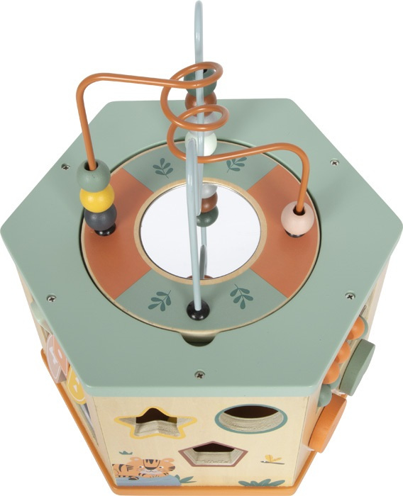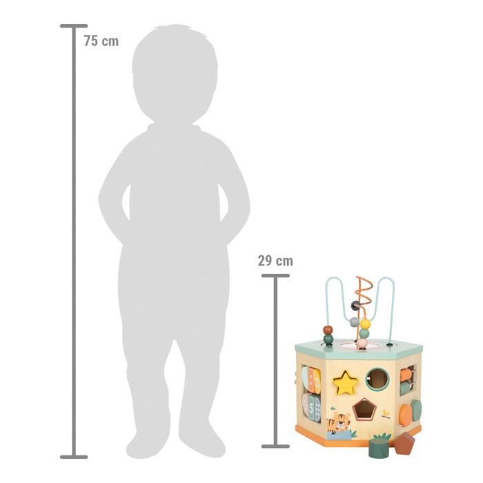 Tato motorická kostka z robustního dřeva s motivem safari nabízí spoustu činností a zábavy na sedmi různorodých plochách. Zaujme kombinací obrázků zvířátek v příjemných barvách se vzhledem přírodního dřeva. Nabízí nepřeberné množství aktivit, které stejnou měrou podporují jemnou i hrubou motoriku, jako je labyrint s barevnými korálky, posuvné labyrinty, zrcátko, vkládací kostky různých tvarů, malé korálkové počítadlo, xylofon, ozubená kolečka a další. Díky praktickému úložnému prostoru uvnitř kostky se vkládací tvary neztratí a odnímatelné víko lze otočit korálkovým labyrintem dovnitř, aby se ušetřilo místo. Palička na xylofon je ke kostce připevněna gumovým poutkem.