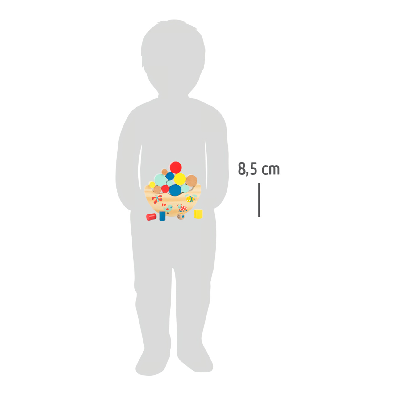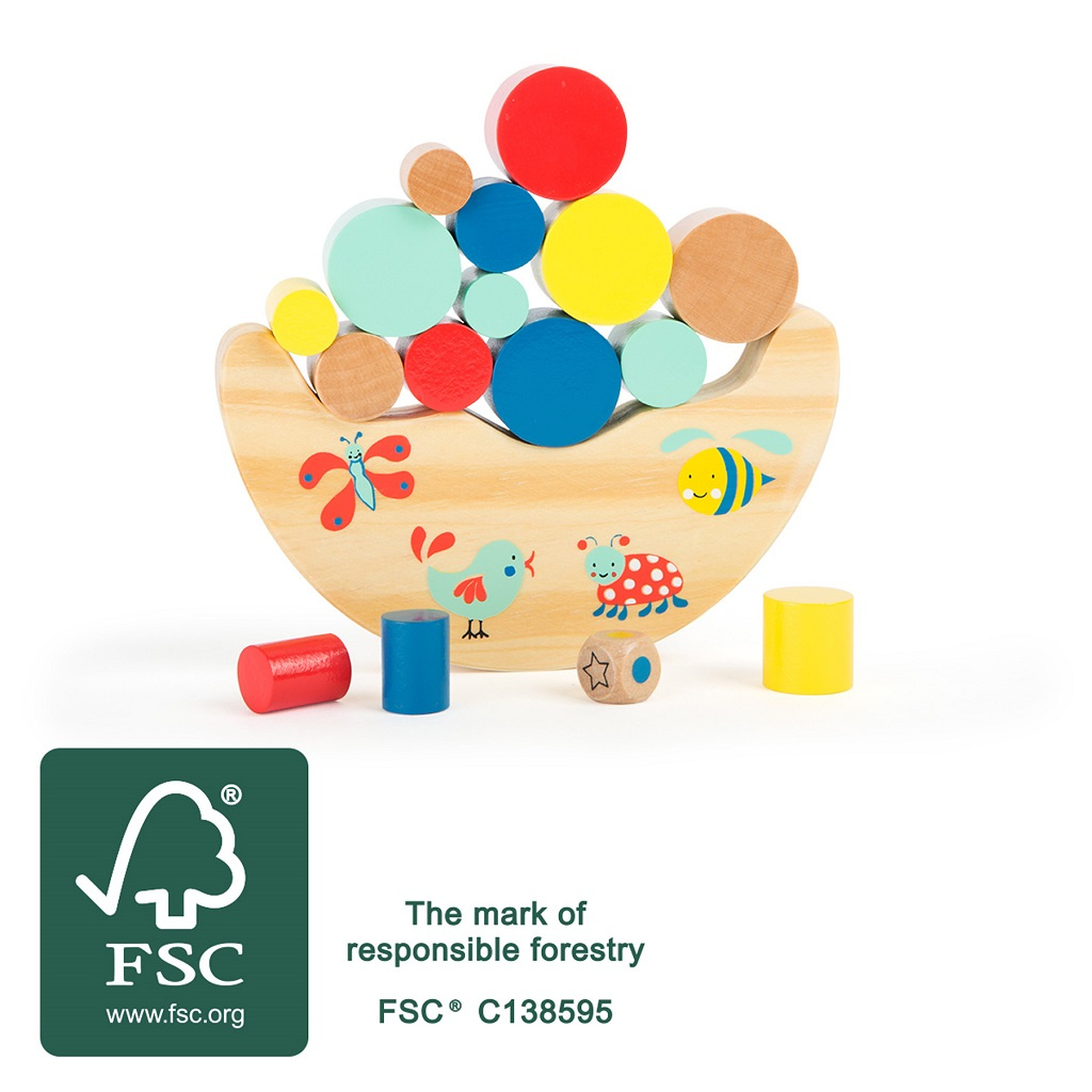 Komu se podaří naskládat tu nejvyšší věž? Velkou výzvou, ve které musí být všechny herní kousky vyrobené ze 100% certifikovaného dřeva FSC® umístěny na vratké houpačce. Obrázek ukazuje, který kus je umístěn jako první.