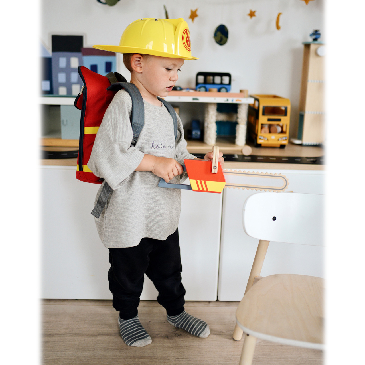 Motorová pila s hasičskou tématikou. S touto robustní motorovou pilou ze dřeva pro děti, nebude nic stát v cestě realistické hře na hasiče. Velká rukojeť je snadno uchopitelné pro dětské ruce. Pila má také natahovací startovací šňůru, se zvukem a vibracemi.
