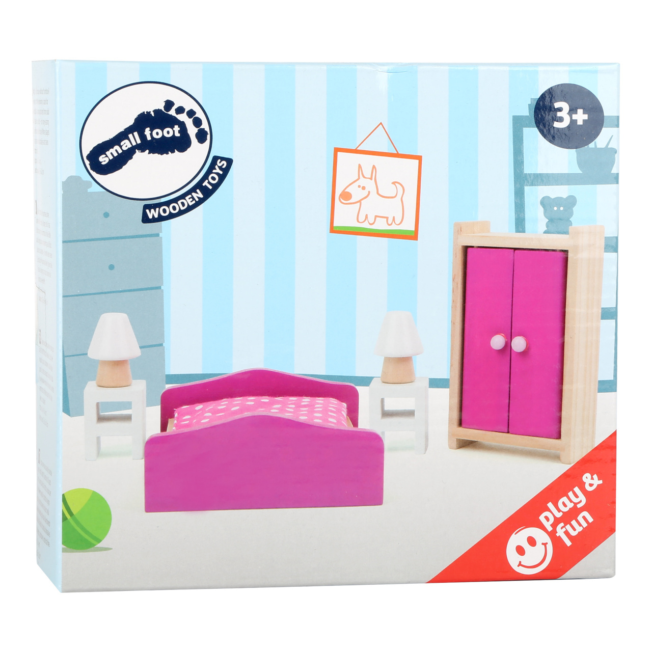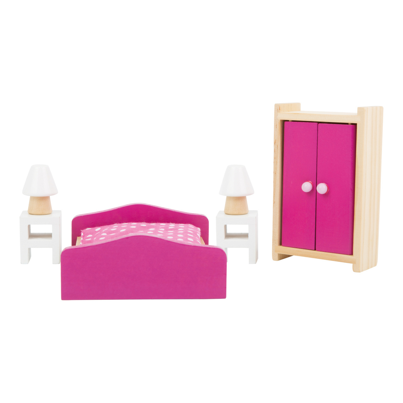 Tato 6dílná sada do ložnice má velikost pro ohýbací panenky do 12 cm. Je vyrobena z masivního dřeva pro dlouhou životnost.