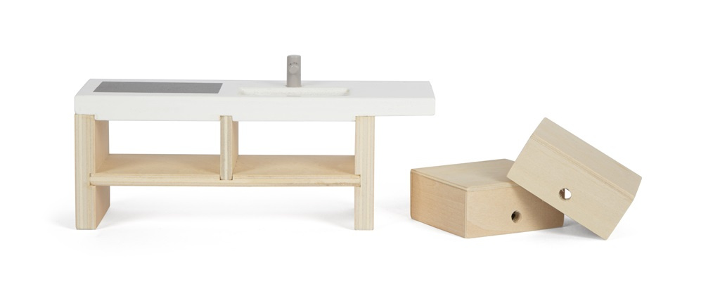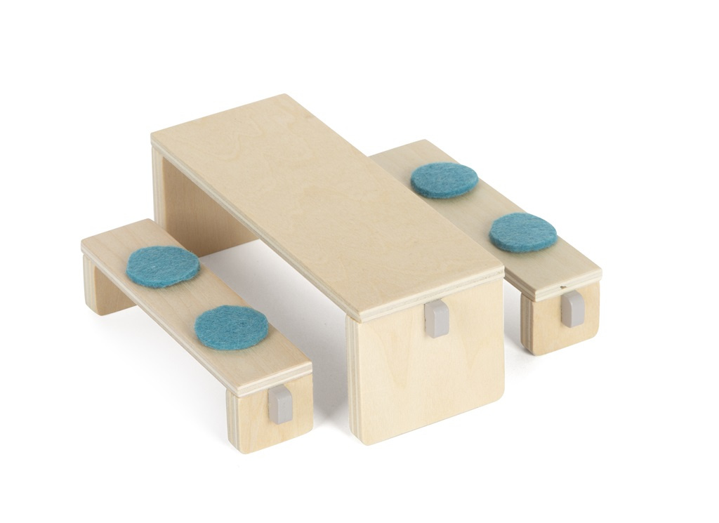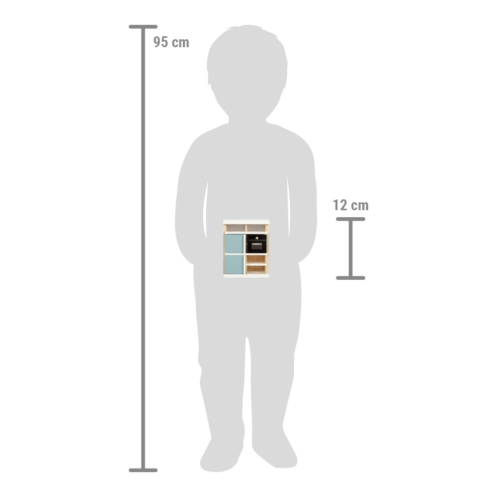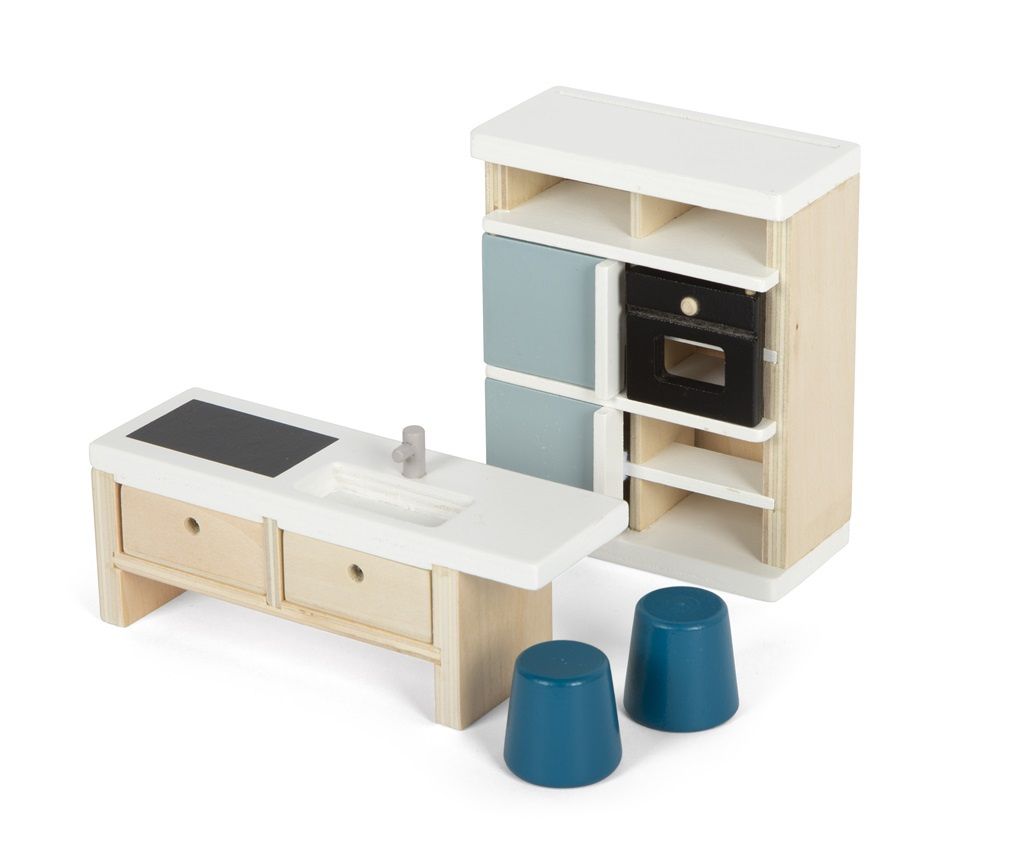 Tato detailně propracovaná kuchyň bude krásným doplňkem každého domečku pro panenky. Skládá se z vysoké kuchyňské skříně, samostatně stojícího kuchyňského ostrůvku, 2 taburetů a stolu se 2 lavicemi se sedáky, které se dají sundat. Součástí kuchyňské skříně je kombinovaná lednice s mrazničkou a trouba s otevíracími dvířky. Kuchyňský ostrůvek má varnou desku a dřez a také dvě vyjímatelné zásuvky. Jako místo k posezení u ostrůvku slouží dva taburety. Děti si mohou nakreslit obsah kuchyňské linky – např. potraviny a vybavení na kartón (3 ks kartónu jsou součástí balení) a ten použít jako zadní stěnu linky.