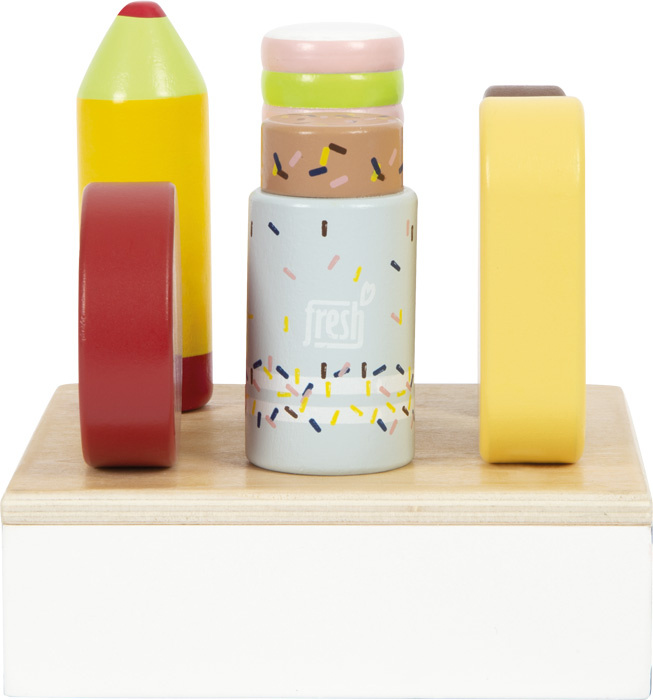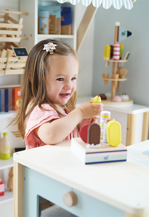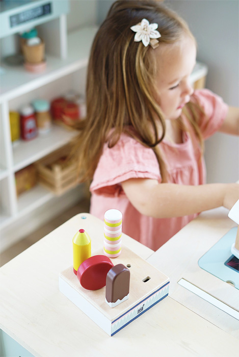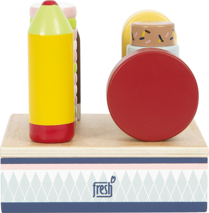 Sada nanuků pro malé prodavače zmrzliny. Tento praktický stojan na zmrzlinu s otvory pro 6 různých příchutí přináší osvěžující pocit ze zmrzlinárny do obchodu s potravinami nebo do dětské kuchyňky. Zajišťuje také, aby byly studené pochoutky podávány ve správném stylu. Každá jednotlivá zmrzlina je vyrobena z certifikovaného dřeva FSC® a vypadá velmi podobně jako její skutečné protějšky. Jemné zbarvení a vysoký podíl viditelného dřeva dělají z tohoto herního setu opravdový poutač v dětském pokoji.