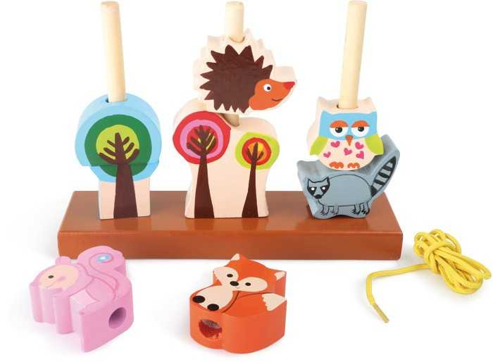 Tato sada umožňuje dílky navléct na šňůrku nebo na dřevěné kolíky. Ježek, liška, veverka, mýval a sova jsou hlavními hrdiny této hry. 3 stromy dotváří lesní atmosféru. Trénink může začít!