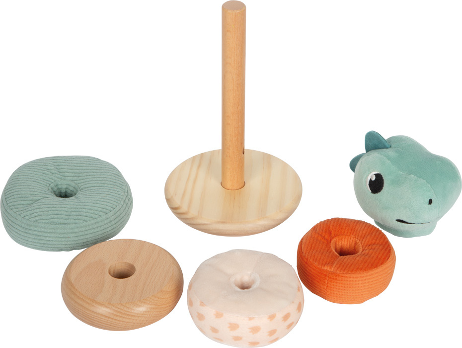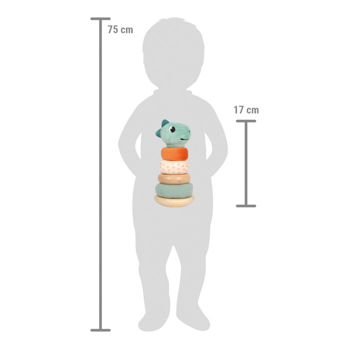 Se stohovací věží v designu barevného dinosaura bude trénink motorických dovedností zábavným a hravým zážitkem! Motorická hračka zaujme malé fanoušky dinosaurů kombinací plyše a dřeva. Trénuje koordinaci ruka-oko a jemnou motoriku, ale také oživí interiér dětského pokoje. Zábavná kolébající se věž se čtyřmi barevnými kroužky, bezpečnou pohyblivou centrální tyčí a usměvavou hlavou dinosaura pomůže dětem při rozpoznávání velikostí a barev. Základna věže je zaoblená, 3 kroužky jsou vyrobeny z látek různých vzorů, barev a textur a 1 kroužek ze dřeva.