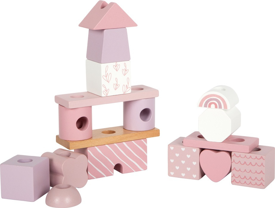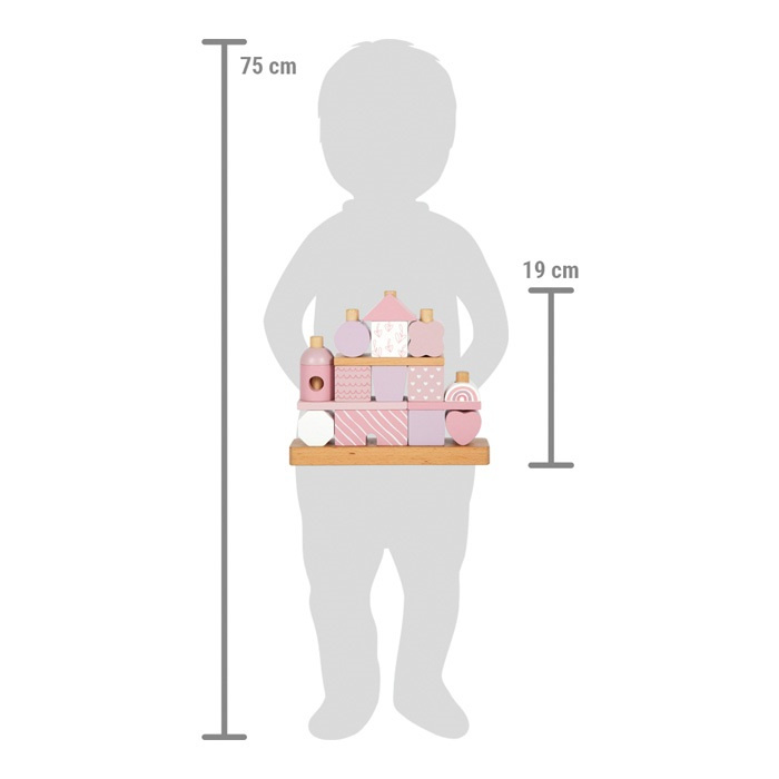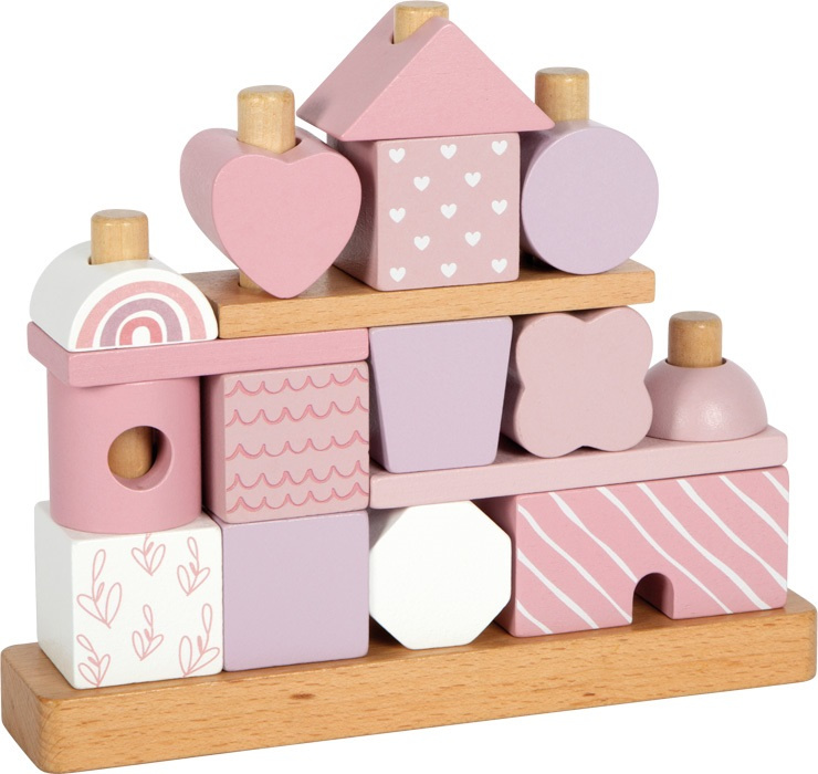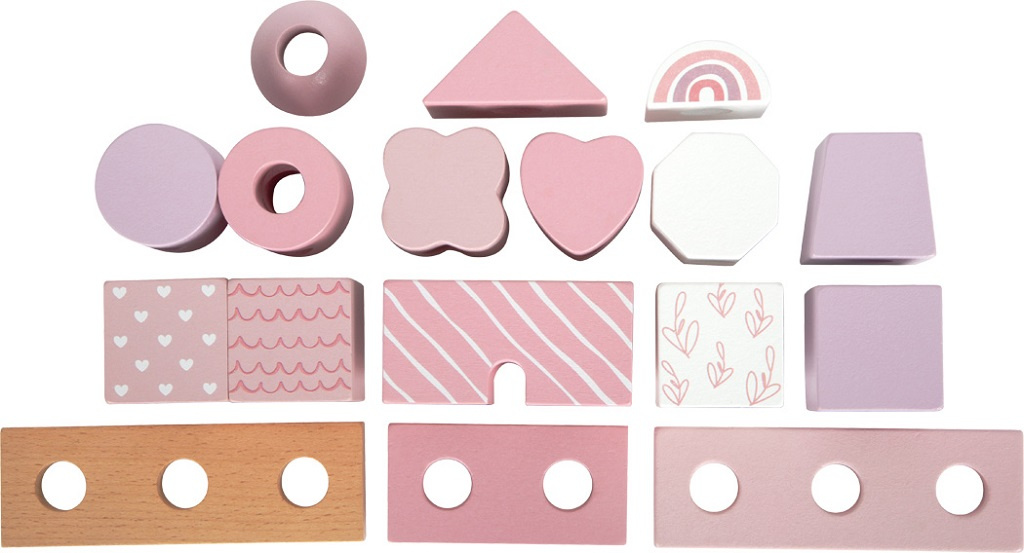 Tento dřevěný stohovací domeček v jemných pastelových odstínech růžové s přírodními prvky okouzlí nejen svým designem, ale i variabilitou. Obsahuje 18 různě tvarovaných a zdobených dílků, které děti inspirují k nasazování na dřevěné tyče a vytváření stále nových variant domečku. Při hraní si tak rozvíjejí jemnou motoriku, koordinaci a kreativitu.