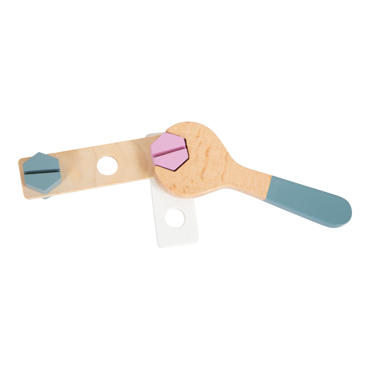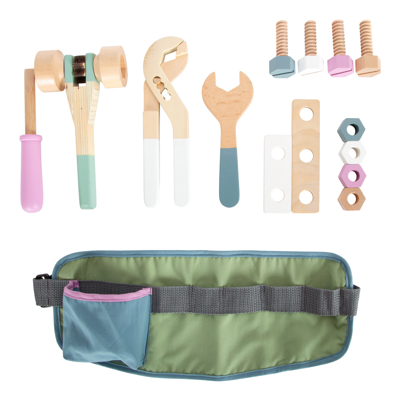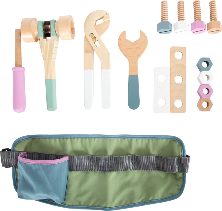 Praktický, nastavitelný opasek na nářadí. S příslušenstvím složeným z děrovaných kusů, šroubů a matic. Nastavitelný dřevěný hasák a ráčna jsou dokonalým doplňkem šroubováku a klíče. Smyčky různých velikostí nabízejí prostor pro všechny zahrnuté nástroje. Nenápadné, skandinávské barevné schéma se spoustou viditelného dřeva; stejně atraktivní pro dívky i chlapce. Přezka se snadno otevírá a zavírá. Skvěle se hodí k dalším výrobkům z produktové řady Nordic.