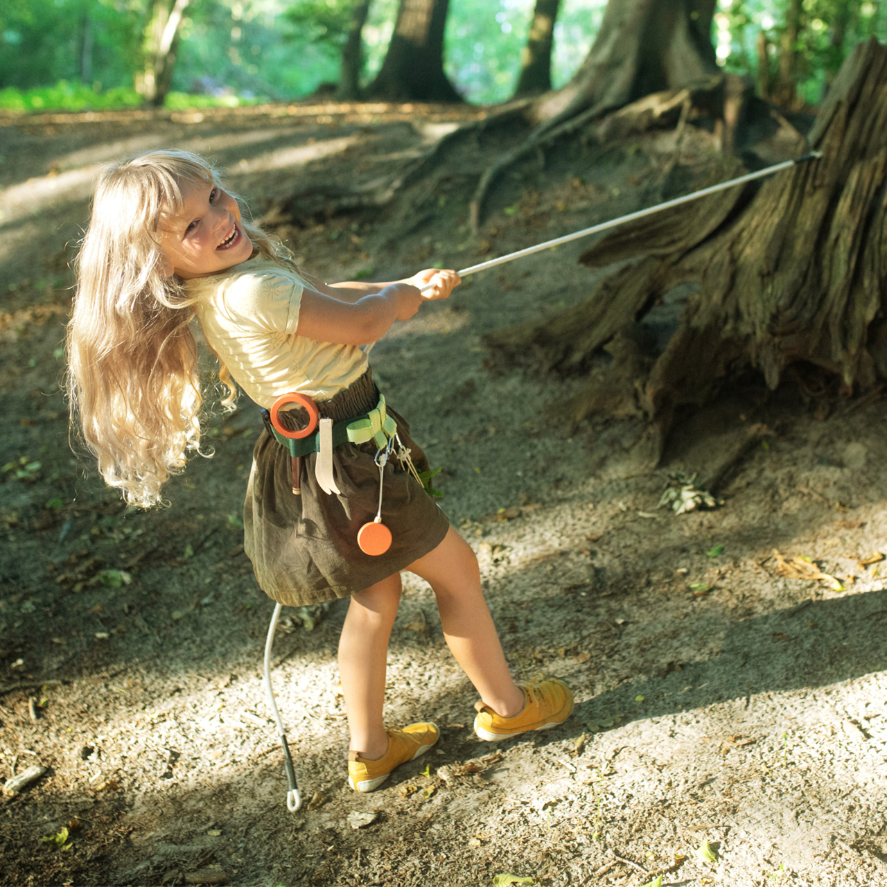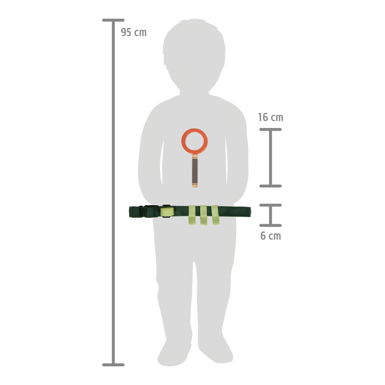 Pro milovníky dobrodružství! Tento opasek s vybavením ponechá dětské ruce volné při každém dobrodružství. Vejde se do něj pohodlně všechno vybavení: píšťalka z pevného dřeva, lupa, pinzeta, kompas, lano a nylonový pytlík, který lze připevnit na poutko nebo karabinu opasku. Opasek lze lehce zapnout na přezku a má také nastavitelnou velikost.
