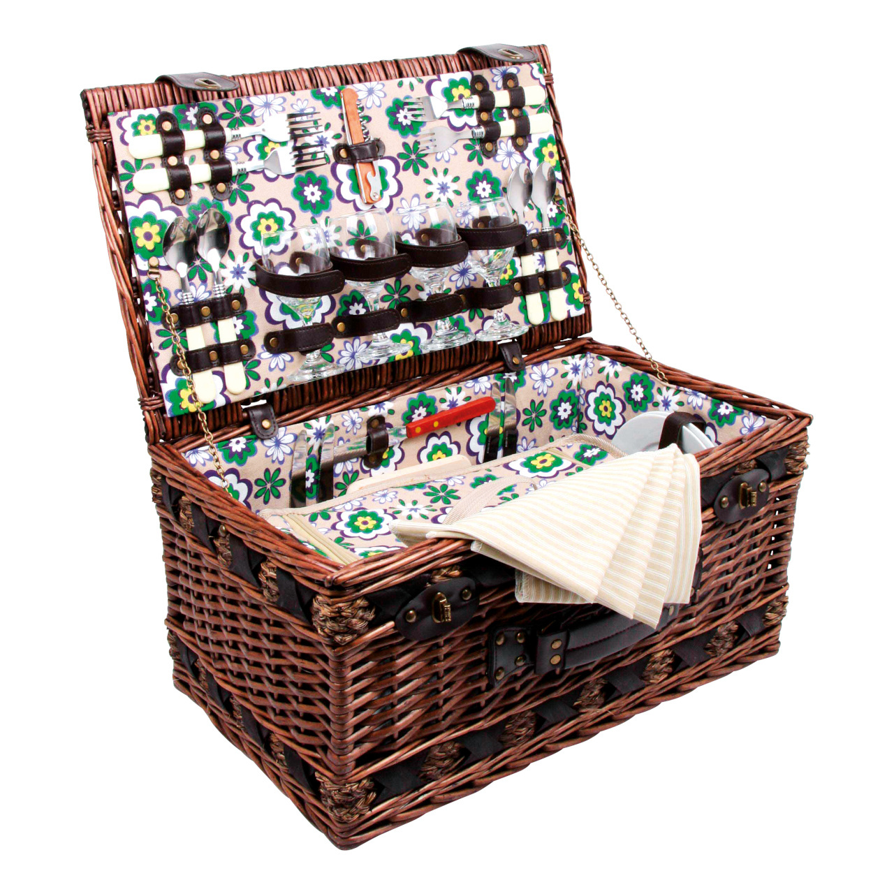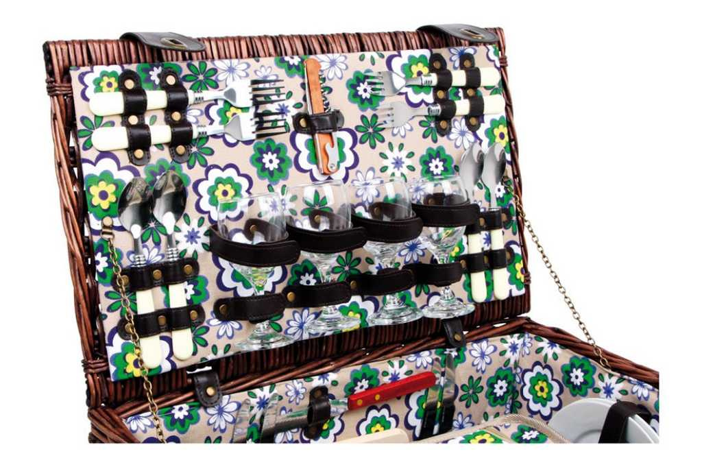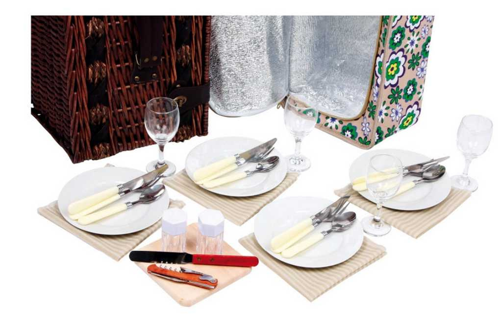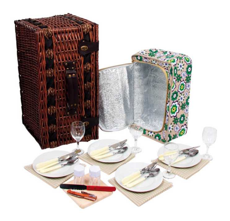 Perfektně vybavený proutěný piknikový koš se silnými proutěnými úchyty a bezpečnými koženými poutky. Koš je kompletně vybavený pro 4 osoby včetně talířů, příborů, sklenic na víno, nožem, pepřenkou, solničkou a ubrousky. Koš je také vybaven vyjímatelnou chladící kapsou, která udržuje jídlo a pití v chladnu!