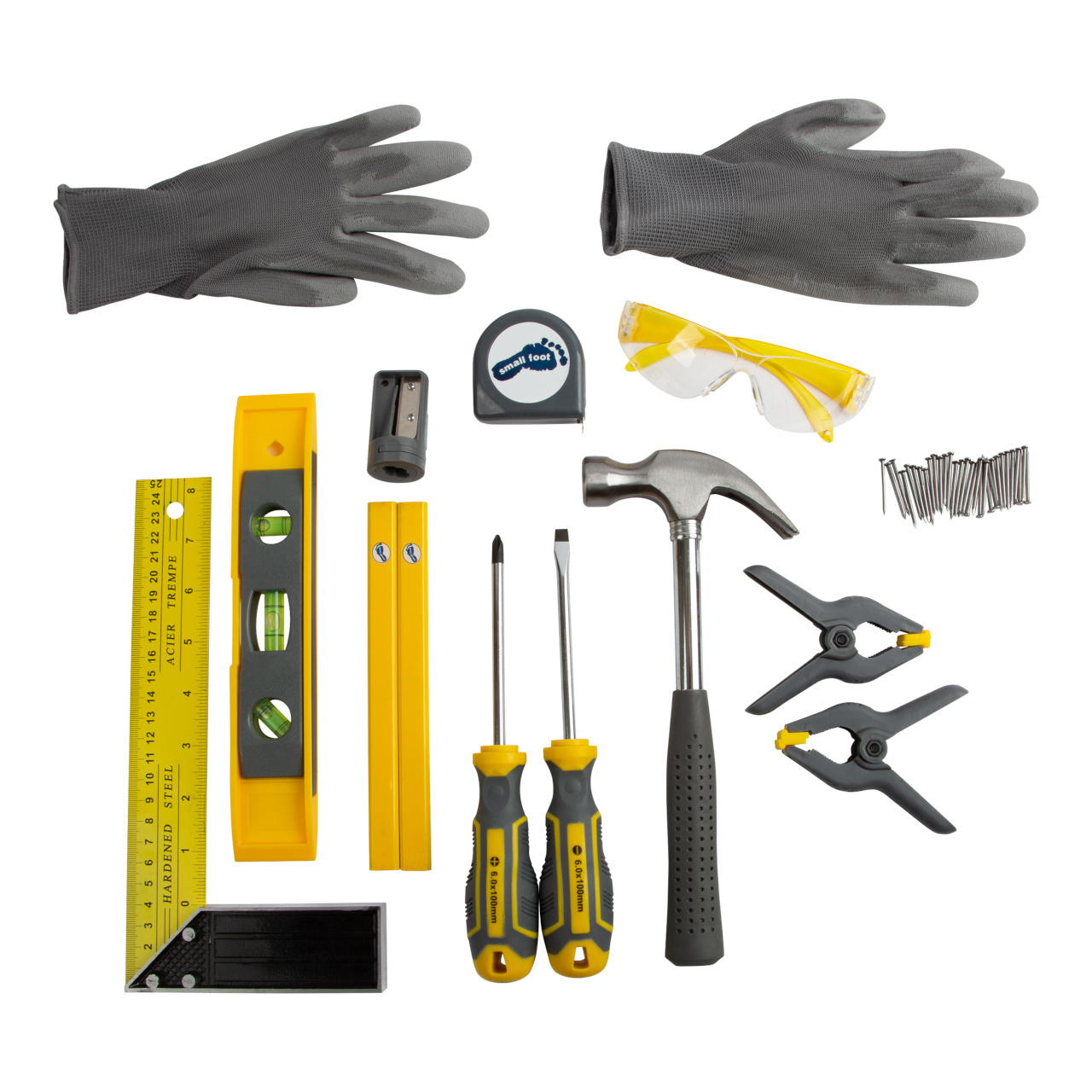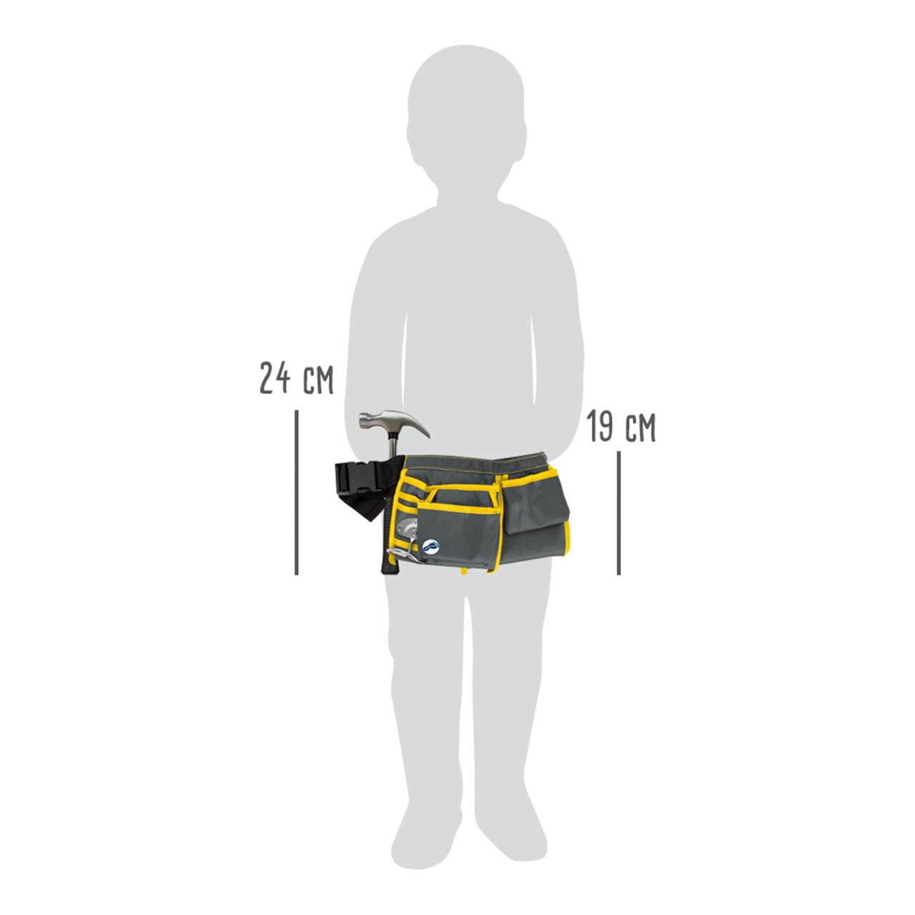 S tímto robustním opaskem na nářadí budou mít děti své nástroje vždy po ruce. Ať už je to tesařské kladivo, plochý nebo křížový Phillips šroubovák, kovový tesařský úhelník, ochranné brýle, pracovní PU rukavice, pérové svěrky a hřebíky, tužka a strouhátko nebo měřící páska. Tento obsáhlý set musí mít každý mladý kutil nebo kutilka. Nastavitelný opasek se zapínáním na přezku má 8 přihrádek, poutko na kladivo, také karabinu. Vodováha má na straně magnetický pásek, je univerzální – dokáže měřit vodorovně, svisle i ve 45°. Kladivo má gumové madlo, aby nevyklouzlo dětem z ruky. Šroubování, zabíjení kladivem, měření, náčrty, to vše trénuje zručnost dětí. Realistické nářadí pro děti bude perfektní pomůckou pro jejich první projekt. Opasek je ideální pro větší děti.
