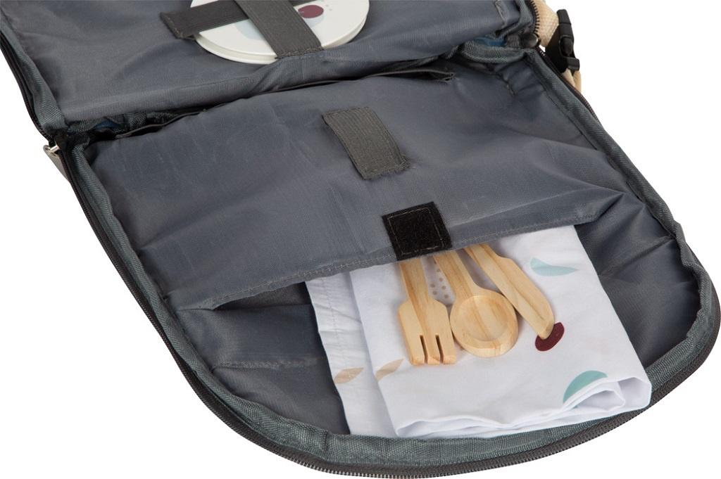 Proměňte každý piknik v nezapomenutelný zážitek s piknikovým batohem! Tento praktický batoh obsahuje vše, co potřebujete pro pohodlné stolování venku: dřevěný talíř, hrnek a jídelní náčiní pro dvě osoby. Dále v něm naleznete termosku, skládací nůž a piknikovou deku. Prostorná vnitřní kapsa na zip umožňuje bezpečné uložení veškerého příslušenství díky pružným páskům a suchému zipu. Nastavitelné ramenní popruhy poskytují optimální pohodlí při nošení a umožňují správné přizpůsobení batohu dítěti. Moderní vzhled, kombinující neutrální bílou barvu, přírodní dřevo a populární trendy barvy, harmonicky zapadá do každého dětského pokoje a skvěle se hodí k dalším produktům z řady „Tasty“. Tento batoh je ideálním společníkem pro nezapomenutelné piknikové chvíle, kreativní hraní a výlety do přírody!