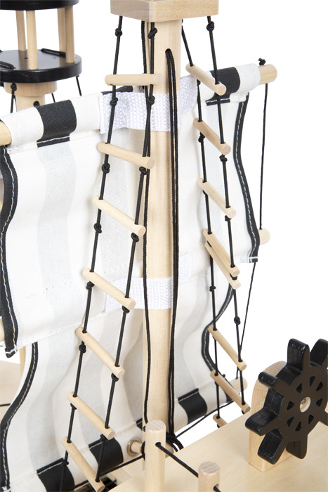 Ahoj piráti! Tato propracovaná pirátská loď vyrobená z robustního dřeva splní přání díky mnoha autentickým detailům. Loď obsahuje také člun, na kterém mohou veslovat dva pohybliví piráti. Obsahuje také žraloka, papouška, truhlu s pokladem, dělo, dva sudy, prkno, vlajku. Všechny plachty lze zvednout a vytáhnout pomocí lan, stejně jako na skutečné lodi. Dělo, které vystřeluje své tři plstěné dělové koule vzduchem, přidává další dávku zábavy. Hrací sada s velkou pirátskou lodí se ideálně hodí pro hru plnou fantazie pro odvážné bukanýry, kteří prozkoumávají moře, objevují nové země a vydávají se na lov pokladů! Interiér pirátské lodi nabízí spoustu úložného prostoru pro všechny nalezené poklady a také truhlu s pokladem na obzvlášť cennou kořist. Pohyblivá kotva připevněná k lanovému navijáku, provazové žebříky, jeřáb, padací dveře na palubě a poklop na zádi, to vše poskytuje příležitost pro realistickou hru. Když má být loď odložena prostorově úsporným způsobem, lze zábradlí a stěžně lodi snadno odstranit. Vhodné pro figurky do velikosti 12 cm.