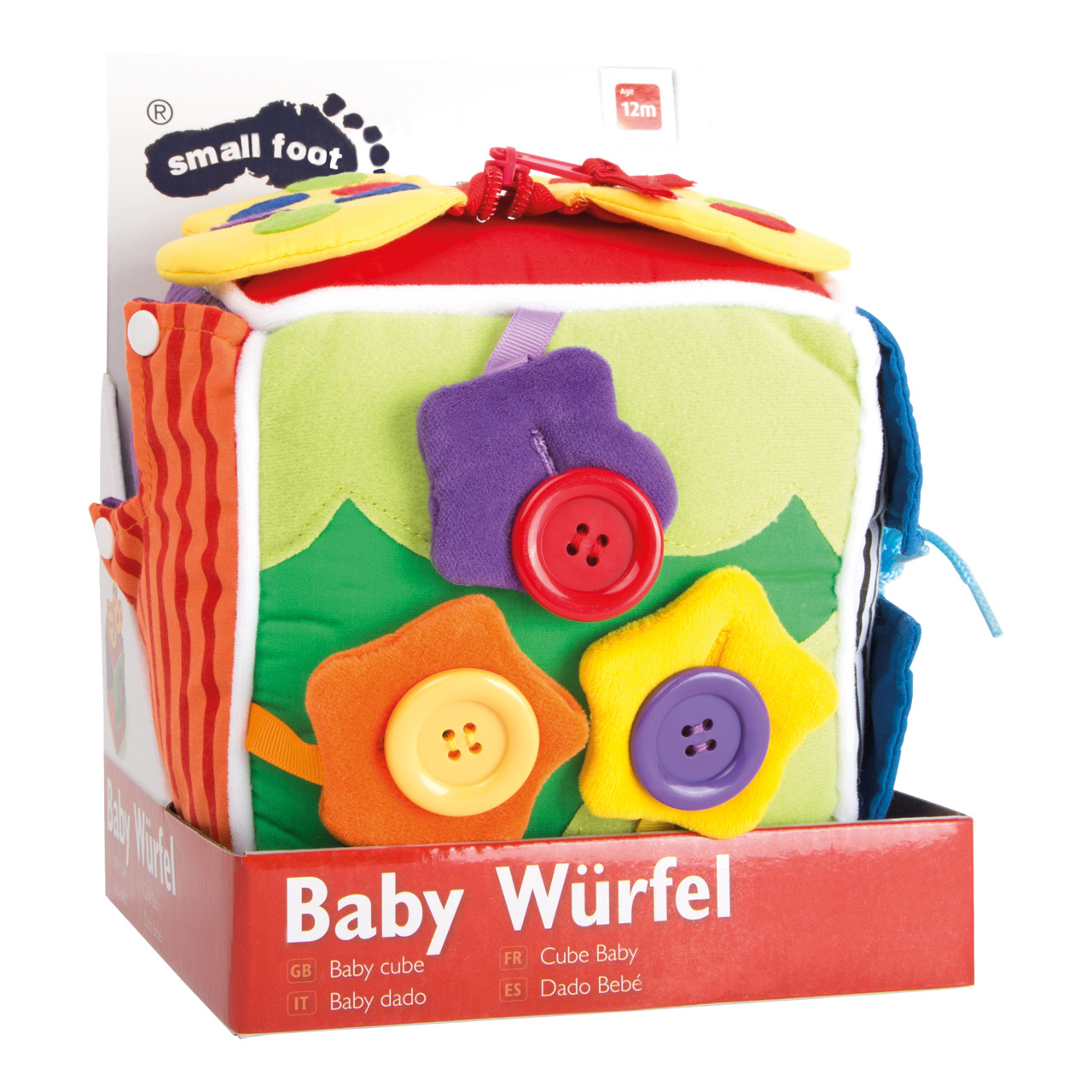 Plyšová kostka s různými zapínáními pro motorická cvičení dětských prstů. Každý typ zapínámí se nachází na jiné straně kostky - šněrování, knoflíky, na zip, na patentky, na suchý zip a pomocí nylonových tkaniček.