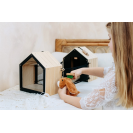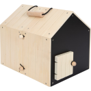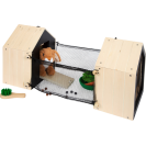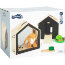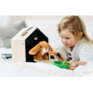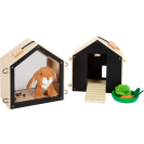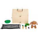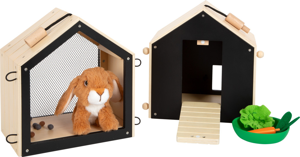Roztomilý přístřešek a v něm ještě roztomilejší čumáček! Králíkárna ze stabilního dřeva (kterou lze použít i pro přepravu) se skládá ze dvou malých boudiček, jenž lze za pomoci smyček propojit. V jedné polovině může plyšový králík nerušeně spát a na druhé straně se přes síť může rozhlížet po svém okolí. K boudám lze připojit dva pletivové ploty a vytvořit tak venkovní výběh. Díky četnému příslušenství je výběh pro králíky okamžitě připraven ke hře a poskytuje realistické situace při hraní rolí. Pokud děti ještě nemohou mít skutečného mazlíčka, pak je tato sada dokonalou alternativou! Děti mohou totiž trénovat důležité sociální a emocionální dovednosti při předstírání péče o zvíře. Balení obsahuje plyšového králíka, smetáček, misku, mrkev ze dřeva a plsti, kousek salátu a pár plstěných bobků. Černou stěnu na zadní straně boudy lze za pomoci křídy popsat.