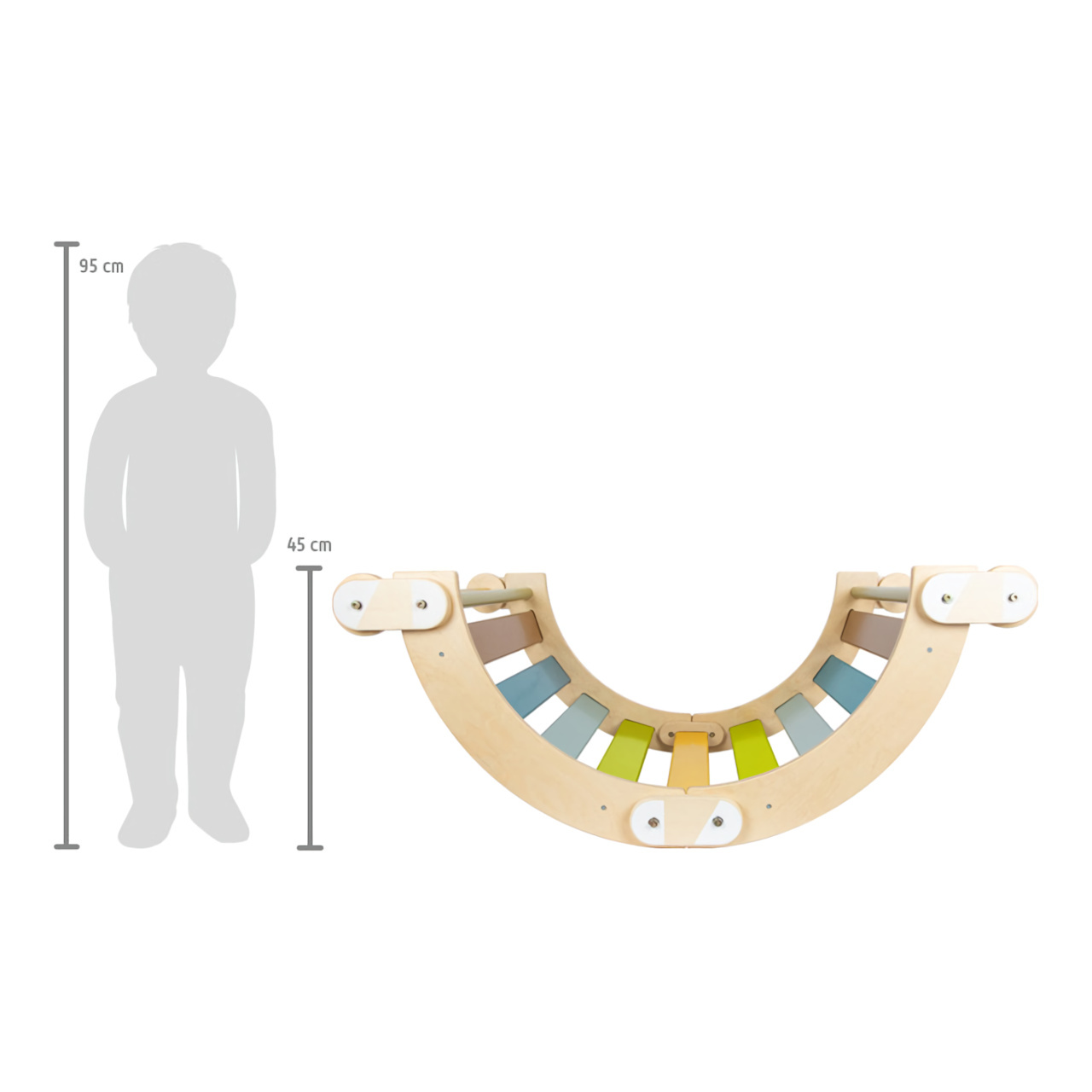 Prolézací houpačku mohu děti využít k sezení, šplhání, houpání, nebo jako domeček k prolézání. Mohou s její pomocí rozvíjet motorické dovednosti, rovnováhu či koordinaci pohybu, a lze ji tak využít i k pohybové terapii. Výšku a náklon hračky je možno individuálně přizpůsobit koncovými prvky opatřenými kolečky pro snadnou manipulaci. Skvěle doplní každý pokoj, nebo herní koutek a spolu s dalšími překážkami řady Small Foot Adventure hravě utvoří konstrukčně i barevně jednotnou gymnastickou dráhu. Je vyrobena z kombinace odolné překližky a masivního dřeva. Výrobek vyžaduje montáž, dodáváno s detailním návodem k sestavení.