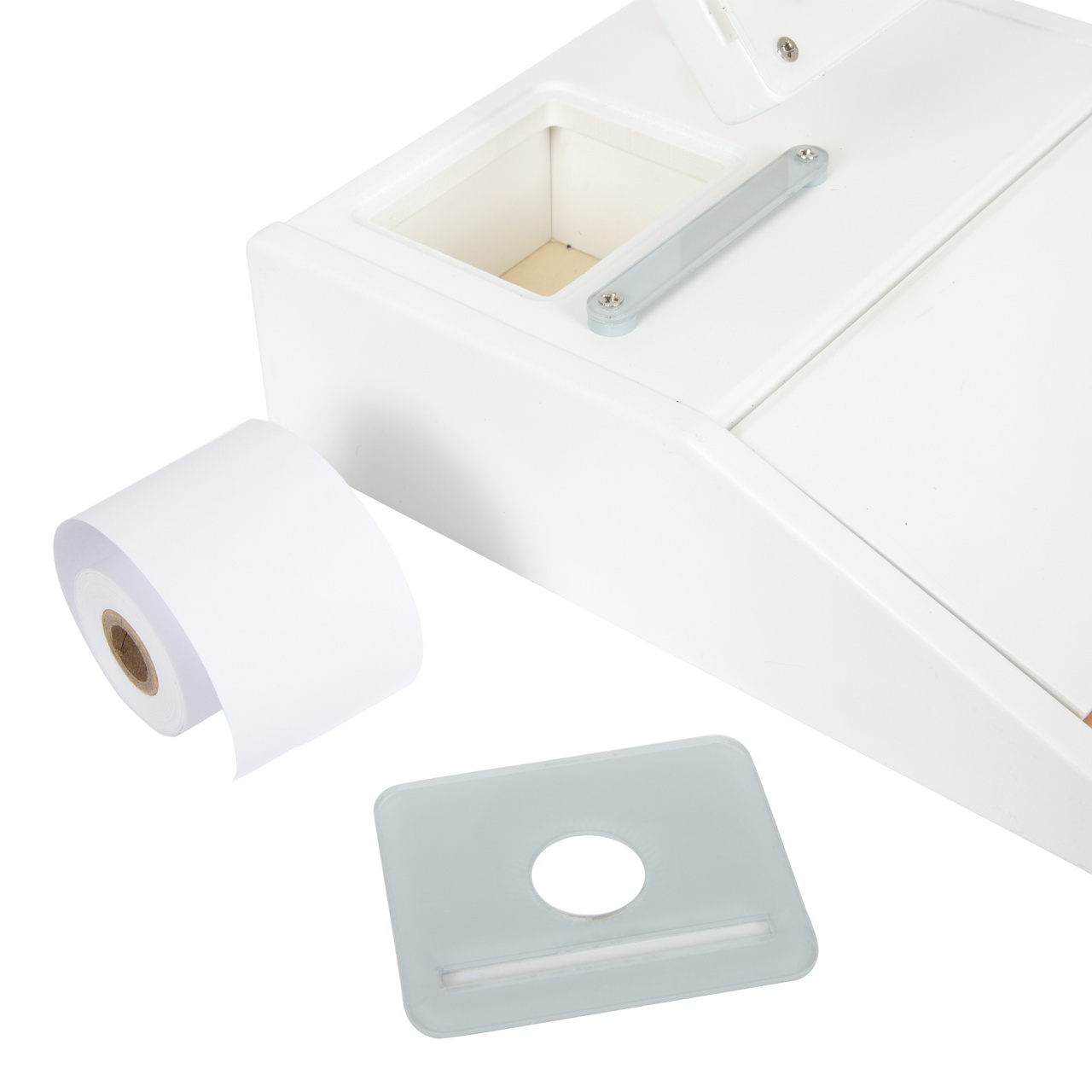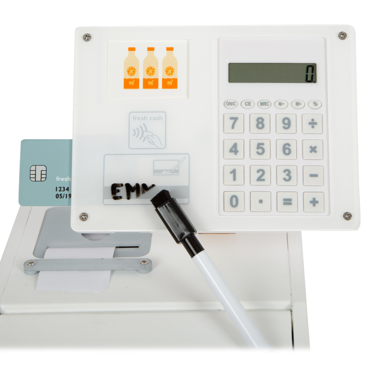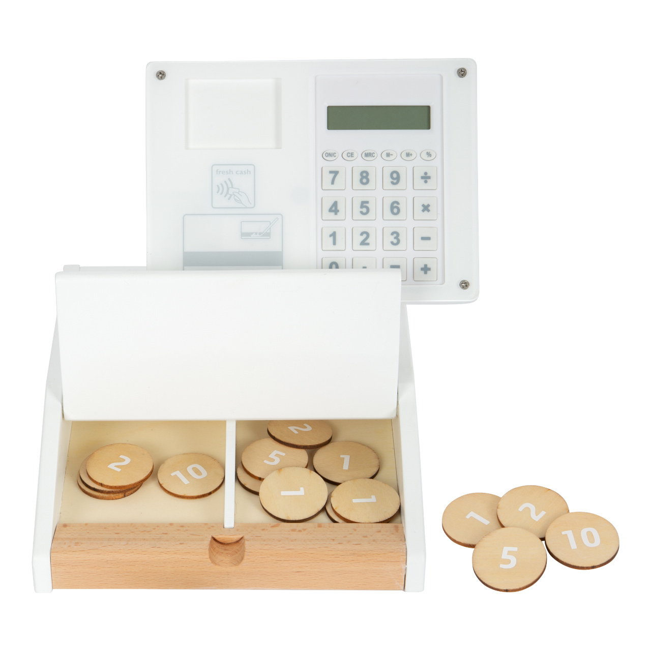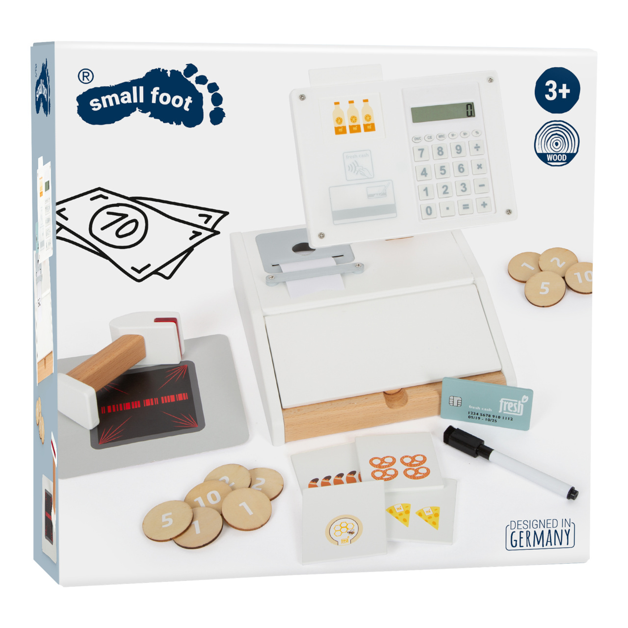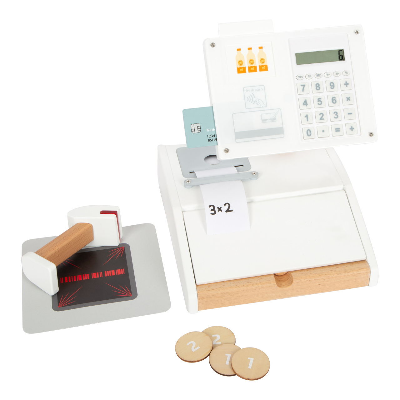 Krásná a moderní pokladna ze dřeva se bude perfektně hodit do dětských prodejních stánků. Má realistické doplňky a zábavné funkce. V balení najdete čtečku čárových kódů, trhací roli účtenek, monitor, skener, debetní kartu, produktové karty, oboustranné dřevěné mince. Dále také fungující kalkulačku, která je integrovaná v monitoru, otevíratelný šuplík pokladny s dvěma přihrádkami, jako v opravdovém supermarketu. Mazatelný fixem se při placení kartou podepište na plexisklo. Baterie nejsou součástí balení.