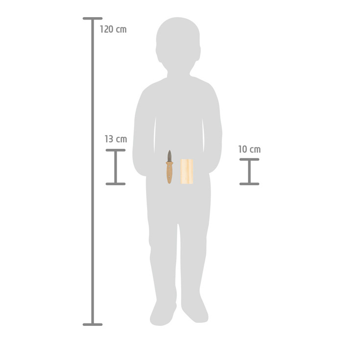 Chceš štípat klacíky, krájet ovoce nebo si připravit klacek na opékání? S outdoorovým dětským nožem to není žádný problém! Díky krátké, robustní čepeli s tupou špičkou, kompaktním rozměrům a dřevěné rukojeti dokonale tvarované pro dětské ruce mohou děti získat první zkušenosti s vyřezáváním a manipulací s nožem. Nůž je bezpečně uložen v látkovém pouzdře s háčky a poutky pro připevnění k opasku. Sadu doplňuje pár speciálních rukavic odolných proti pořezání a dřevěný řezací špalíček. Čepel tohoto outdoorového nože je ostrá, protože tupé čepele nejsou v žádném případě bezpečnější než ostré! Při řezání tupým nožem musíte použít mnohem více síly, což zvyšuje riziko vyklouznutí nože a zranění. Dětské nože na vyřezávání by samozřejmě měly být i tak vždy používány pod dohledem dospělých a v rámci pevně stanovených pravidel. Nože nejsou hračky, ale nástroje! Jsou ideální pro výlety do přírody, dobrodružství a expedice - protože s dětským outdoorovým a průzkumným vybavením se svět za dveřmi stane vzrušujícím místem plným dobrodružství!
