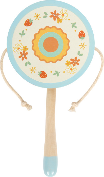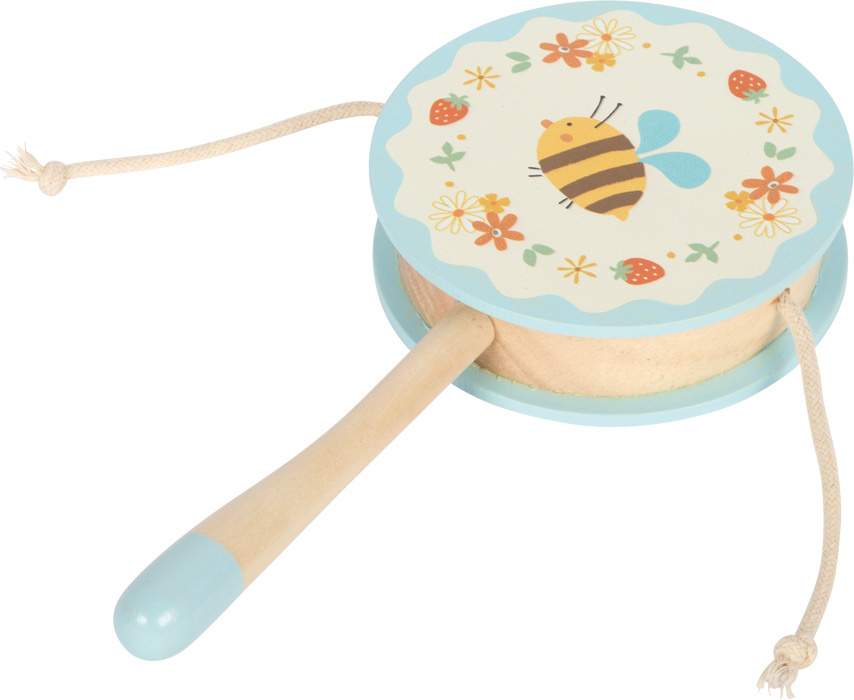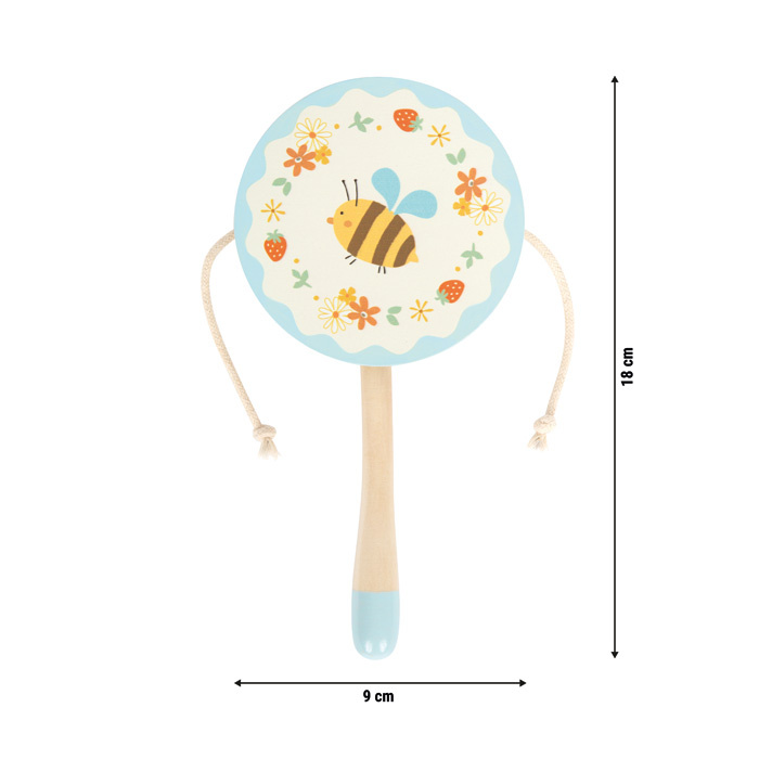 Rytmus na dosah ruky! Tento roztomilý bubínek se snadno vejde do malé dětské ručky a přináší spoustu rytmické zábavy! Při hraní navíc podporuje koordinaci oko–ruka a první seznámení se světem zvuků. Rotační bubínek je krásně barevný s veselým motivem včelky a květiny. Je ideální pro malé hudebníky, kteří rádi zkoumají, jak věci zní. Jak to funguje? Stačí uchopit bubínek za dřevěnou rukojeť a roztočit ho mezi dlaněmi. Dvě dřevěné kuličky na provázku začnou při pohybu narážet do bubínku a vytvářejí zábavný rytmický zvuk. Děti si tak přirozeně procvičují motoriku i cit pro rytmus.