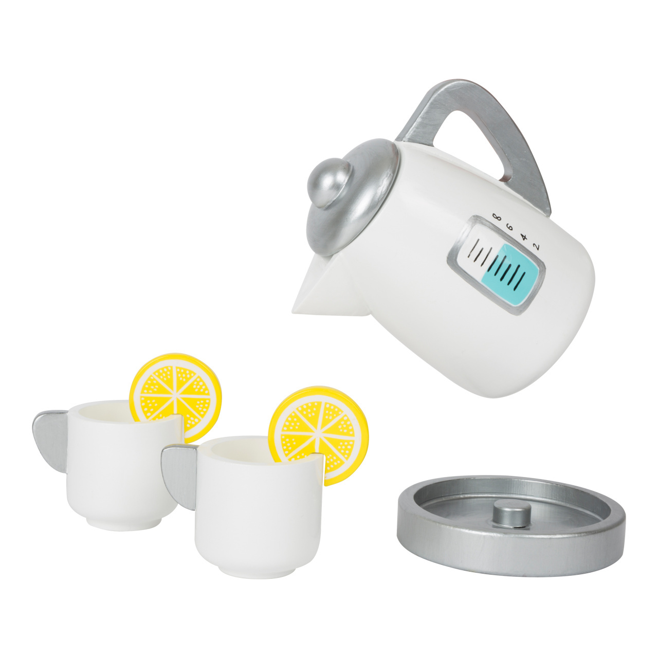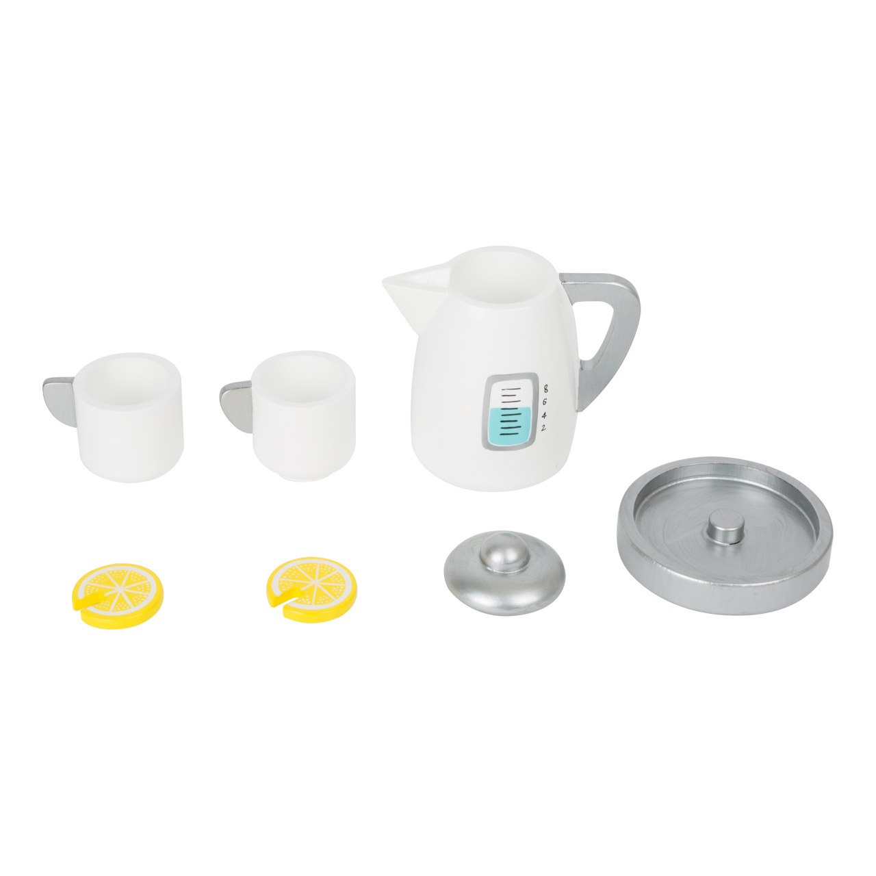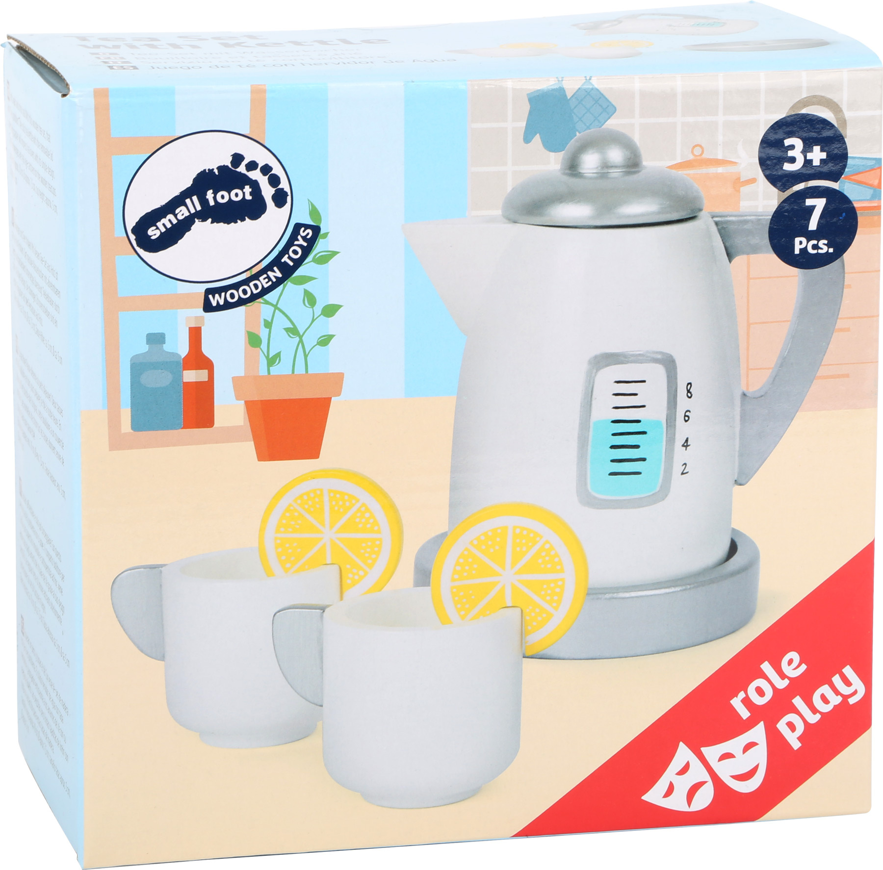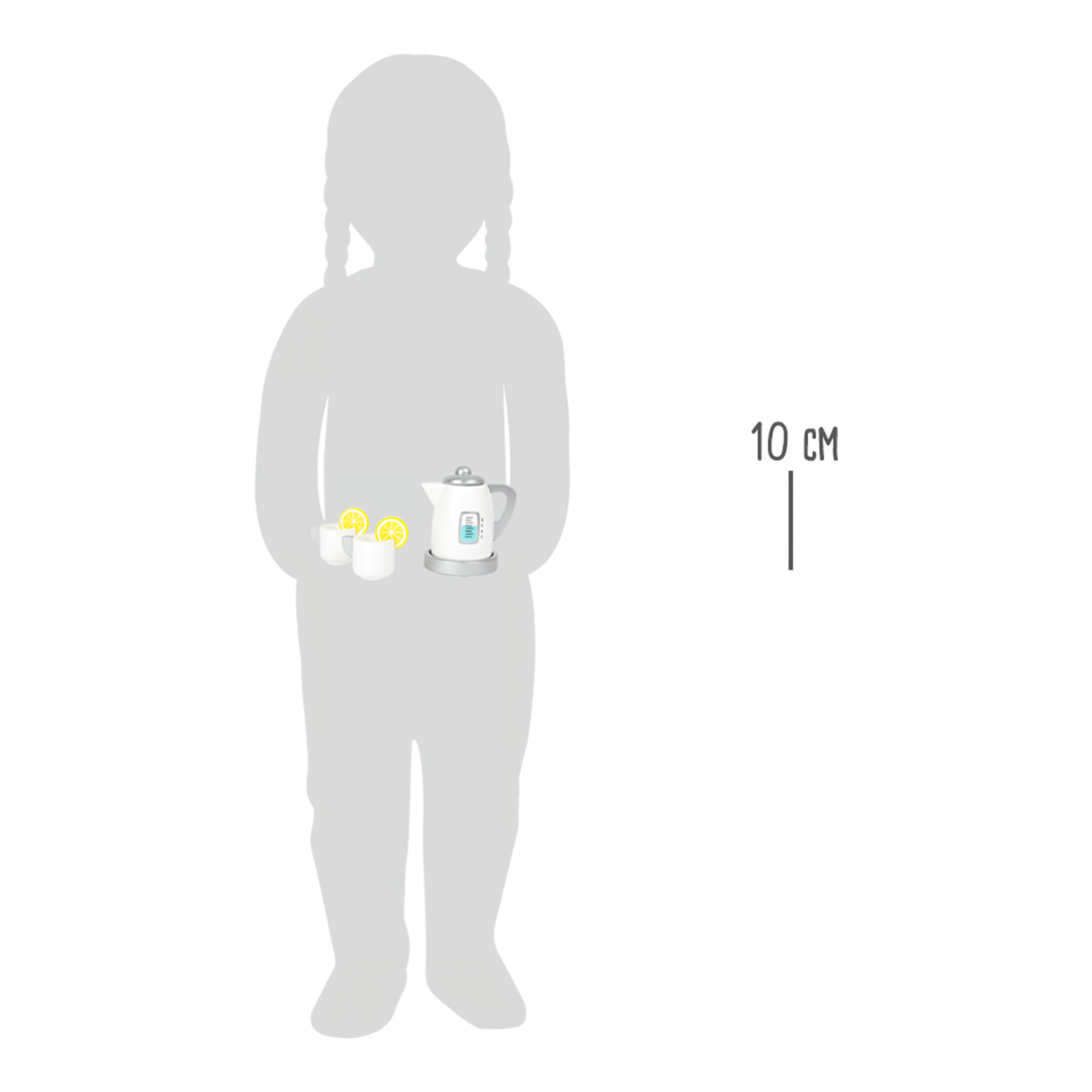 Není nad šálek horkého čaje ozdobený šťavnatým plátkem citrónu! Naučte děti pravidla servisu a společenského chování se soupravou rychlovarné konvice a hrníčků. Skvěle doplní dětské kuchyňky, jiné servisy, snídaňové sady, nebo makety pečiva a zákusků. Součásti jsou vyrobeny z kombinace masivního dřeva a silné překližky, hračka díky tomu může nabídnout vysokou odolnost a životnost.