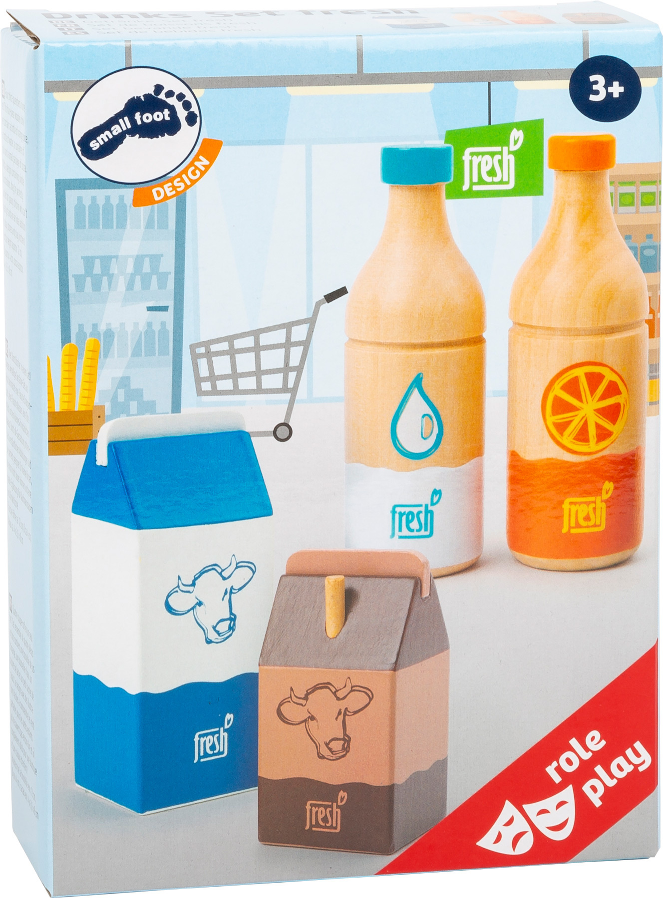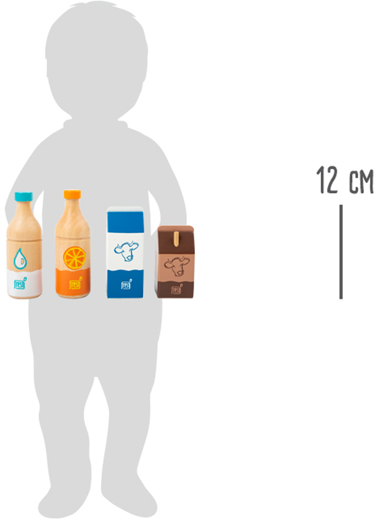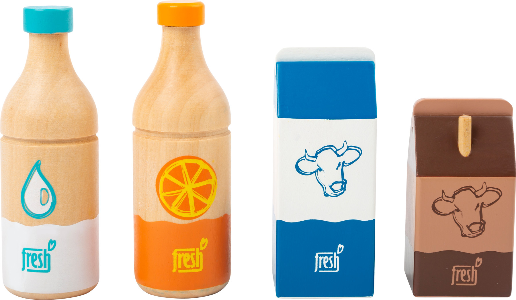 Čtyři nápoje okamžitě zaženou žízeň! Tato čtyřdílná dřevěná nápojová sada obsahuje láhev pomerančového džusu, láhev vody, krabici čerstvého mléka a malé kakao s brčkem. Výstižné ilustrace a ikonické barevné provedení je snadno čitelné. Dřevěné provedení zaručuje dlouhotrvající kvalitu.