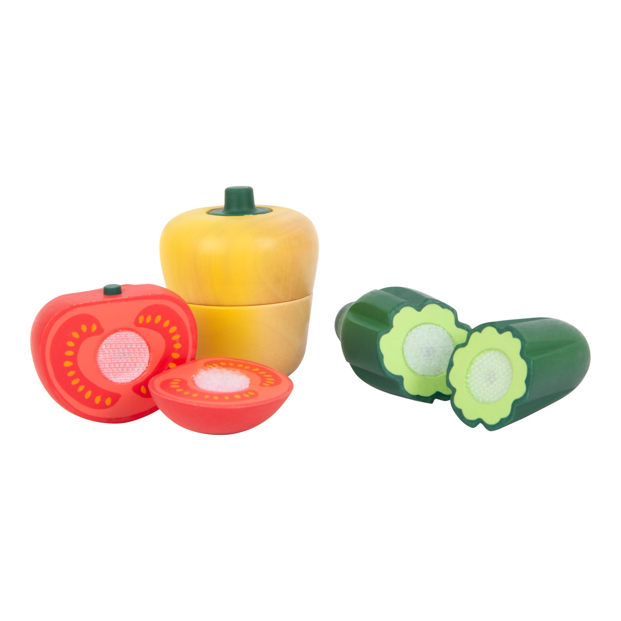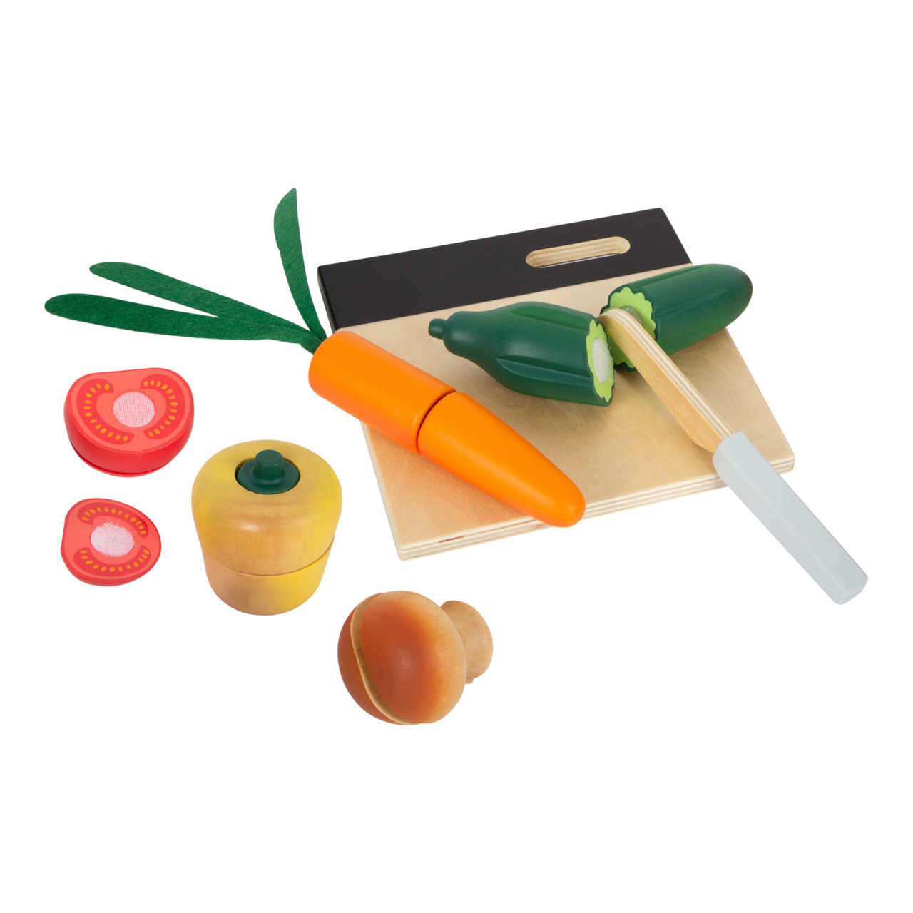 Je opravdu důležité naučit se správnou techniku krájení, s touto hračkou to půjde jako po másle. Paprika, žampion, rajče, okurka a mrkev – v této sadě je vše! Přirozeně vypadající a detailní zelenina drží dohromady pomocí suchého zipu. Díky udržitelnému obalu se děti naučí něco nového o ekologii. Krájecí prkénko lze díky oka pověsit.