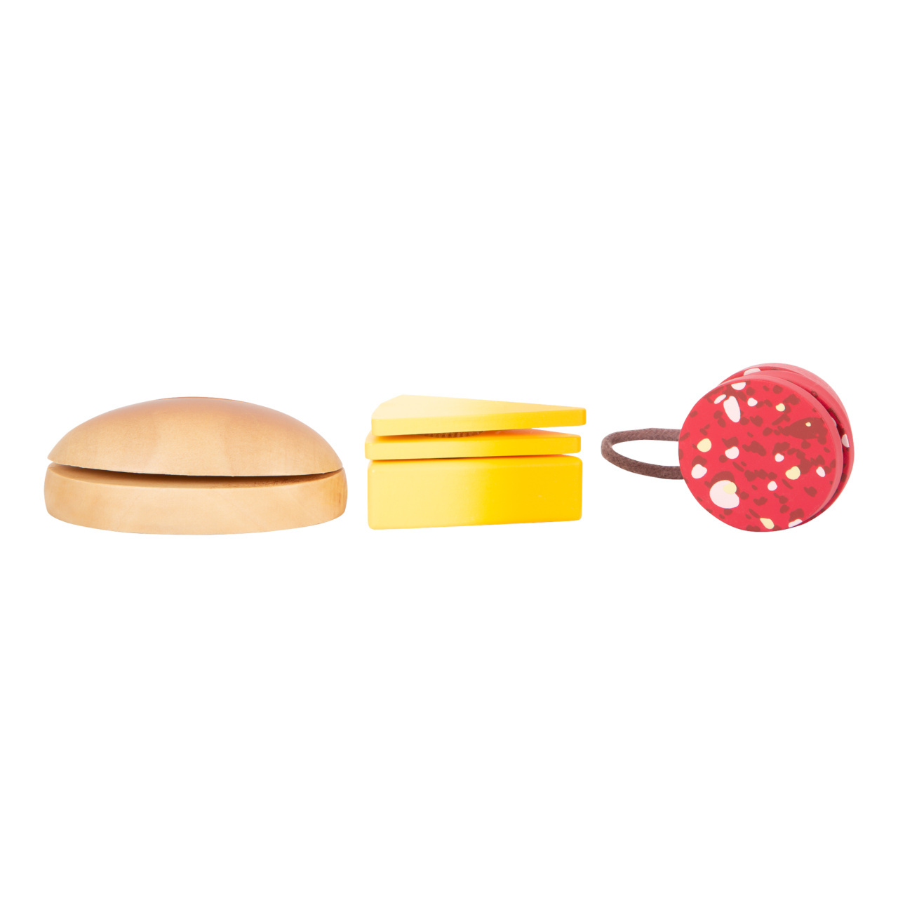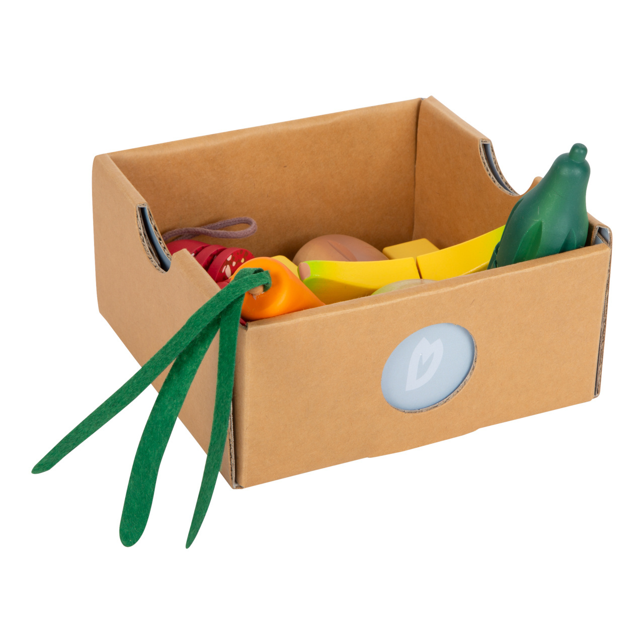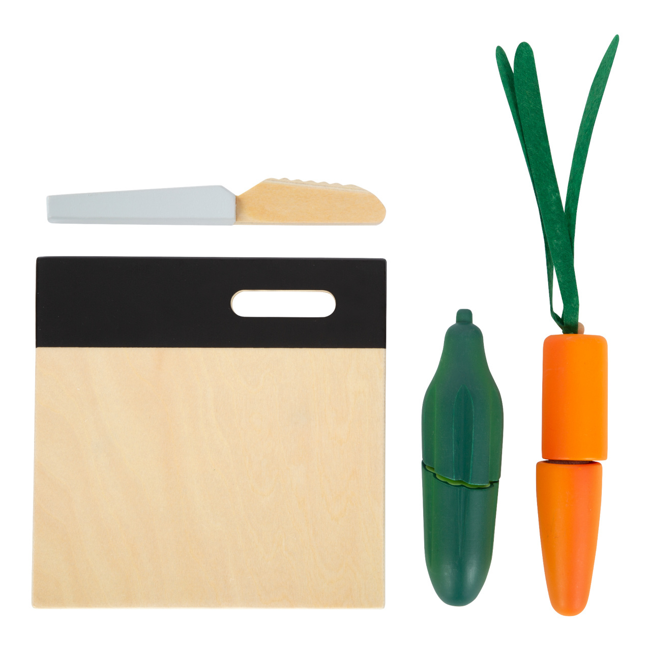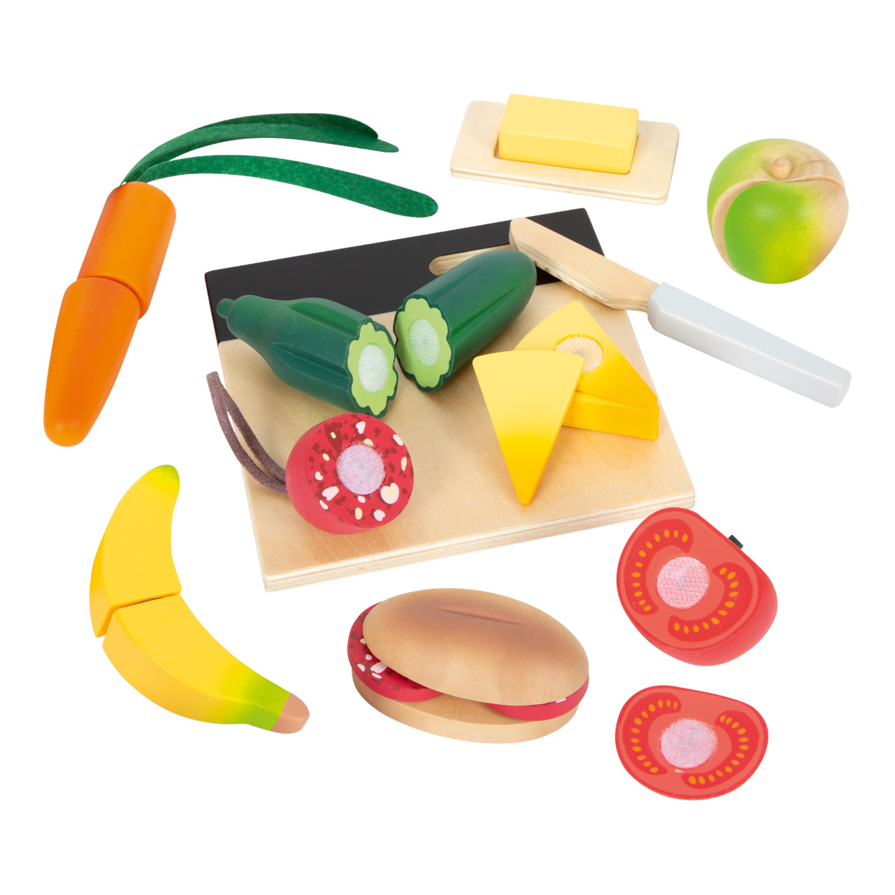 Je opravdu důležité naučit se správnou techniku krájení, s touto hračkou to půjde jako po másle. Rajče, okurka, mrkev, jablko, banán, kus sýra, salám, máslo a pečivo – v této sadě je vše! Přirozeně vypadající a detailní potraviny drží dohromady pomocí suchého zipu. Díky udržitelnému obalu se děti naučí něco nového o ekologii. Krájecí prkénko lze díky oka pověsit.