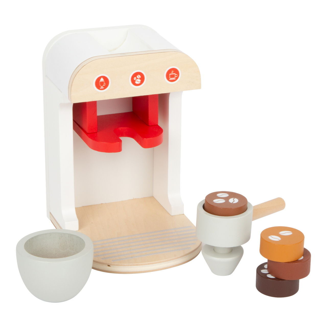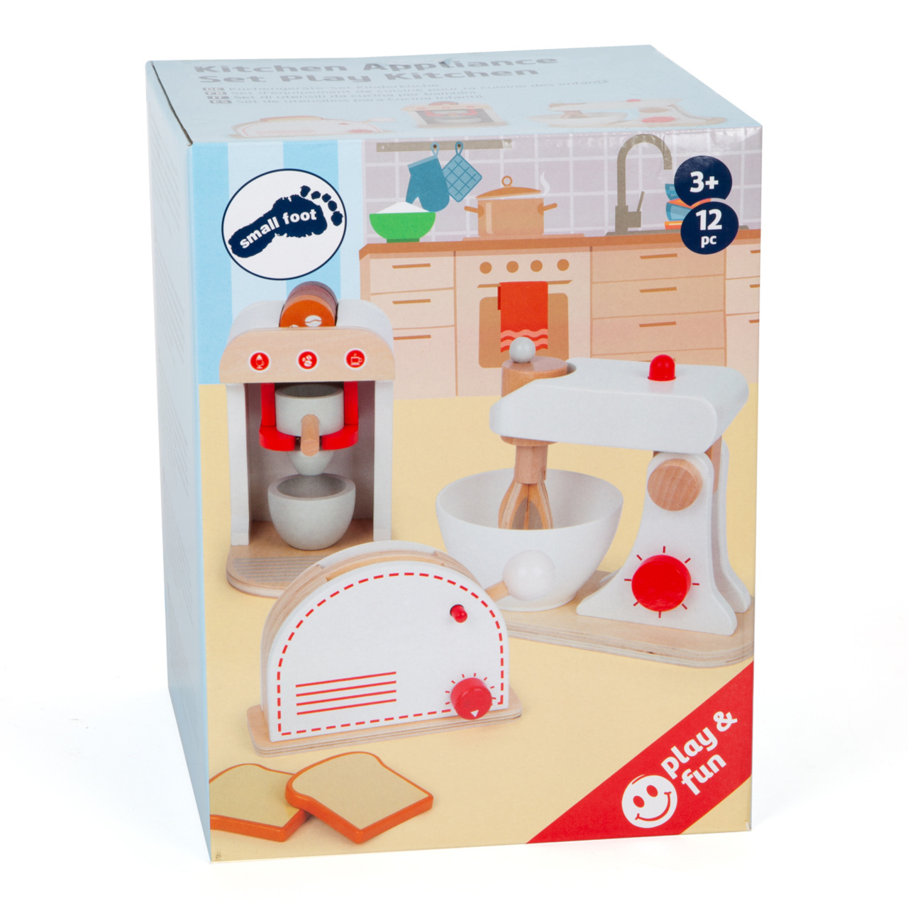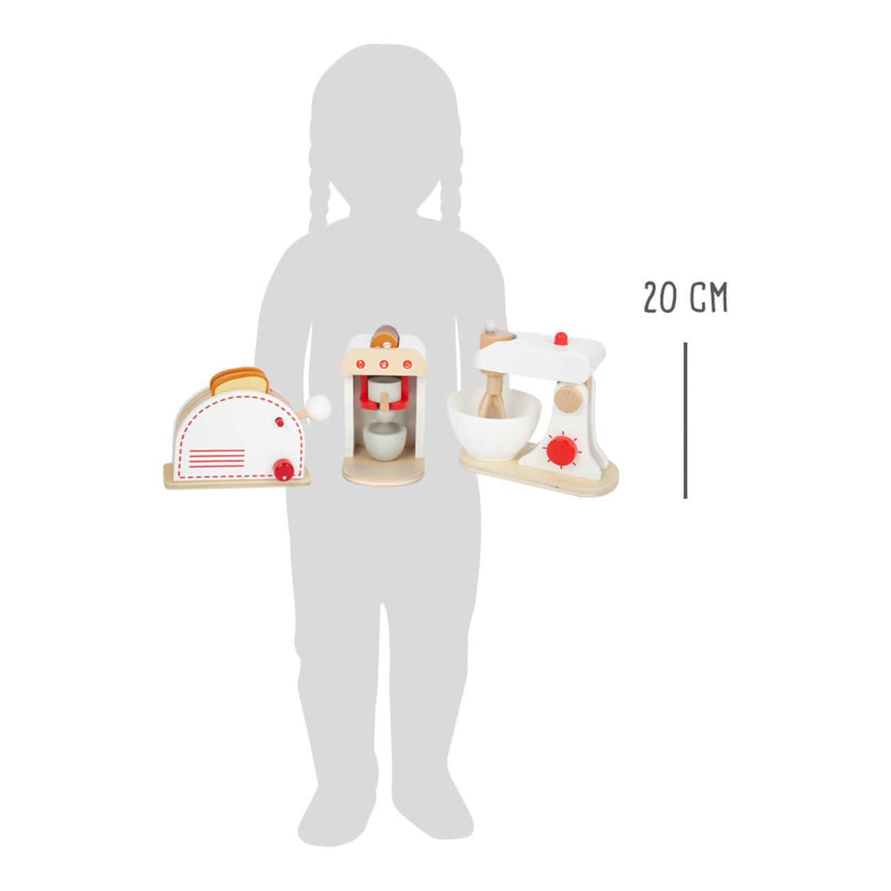 Kompletní sada populárních kuchyňských spotřebičů! Tato sada nabízí toaster, kávovar a mixér, takže vše, co potřebuje každá správná kuchyň. Dřevěné spotřebiče děti podporují ve hře na role, jsou také velmi realistické. Mají klikající ciferníky, toaster má také páčku, kterou „vystřelíte“ opečené toasty, metla mixéru se otáčí. Kávovar má různě silná kávová zrna, takže si můžete udělat espresso, cappuccino nebo latte.