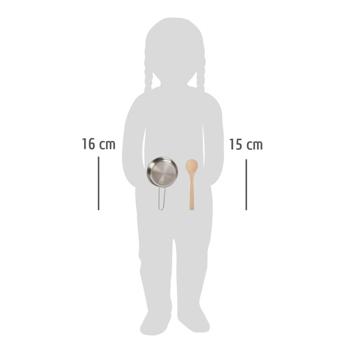 Obsáhlá sada na vaření se skládá z hrnce s poklicí, pánve, metly, špachtle a dřevěné vařečky. V balení také dětská zástěra, podložka pod hrnec a textilní chňapka. Odnímatelné víko hrnce pro realistické hraní. Nádobí a kuchyňské potřeby mají velikost vhodnou pro děti. Zástěra s velkou náprsní kapsou, kam se vejde kuchyňské náčiní. Ideální doplněk do dětské kuchyňky. Podporuje v představivé hře na role.