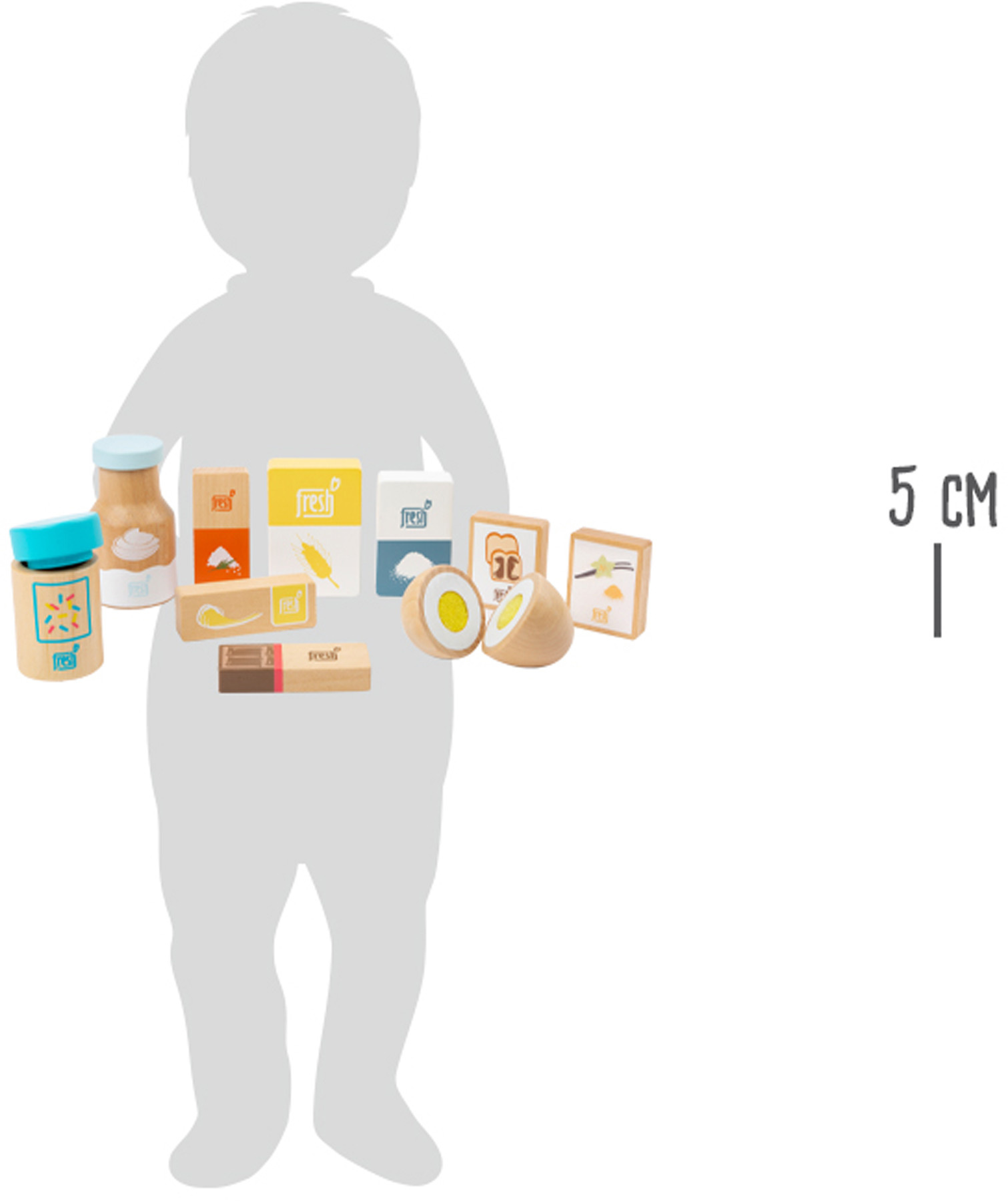 Pozor, všichni pekaři a cukráři! Tato 10dílná sada dřevěných ingrediencí k pečení nabízí vše, co si srdce mladých pekařů žádá. Kromě mouky zde naleznete cukr, smetanu, sůl a prášek do pečiva, také balení vanilkového cukru a rozložitelné vajíčko. To je to nejdůležitější na pečení v domácí kuchyňce. Hotový produkt posypeme čokoládou a zdobením a můžeme podávat!