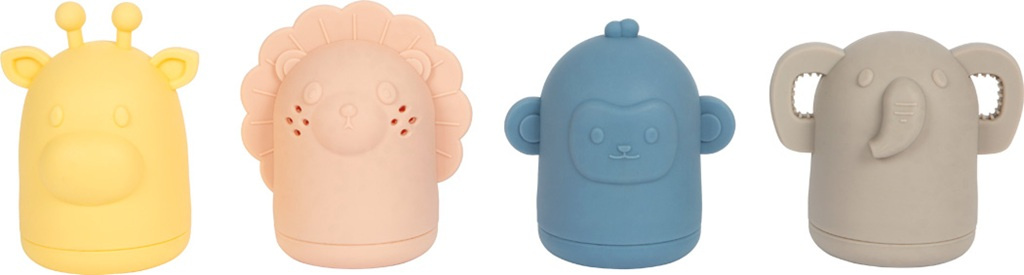 Tato čtyřdílná sada měkkých silikonových hraček přinese spoustu zábavy do vany, na pláž nebo ke stolku s vodní hrou. Roztomilí kamarádi – lev, slon, žirafa a opička – mají různé textury a detaily, a každé zvířátko stříká vodu trochu jinak. Děti tak při koupání zažijí spoustu překvapení a smíchu!