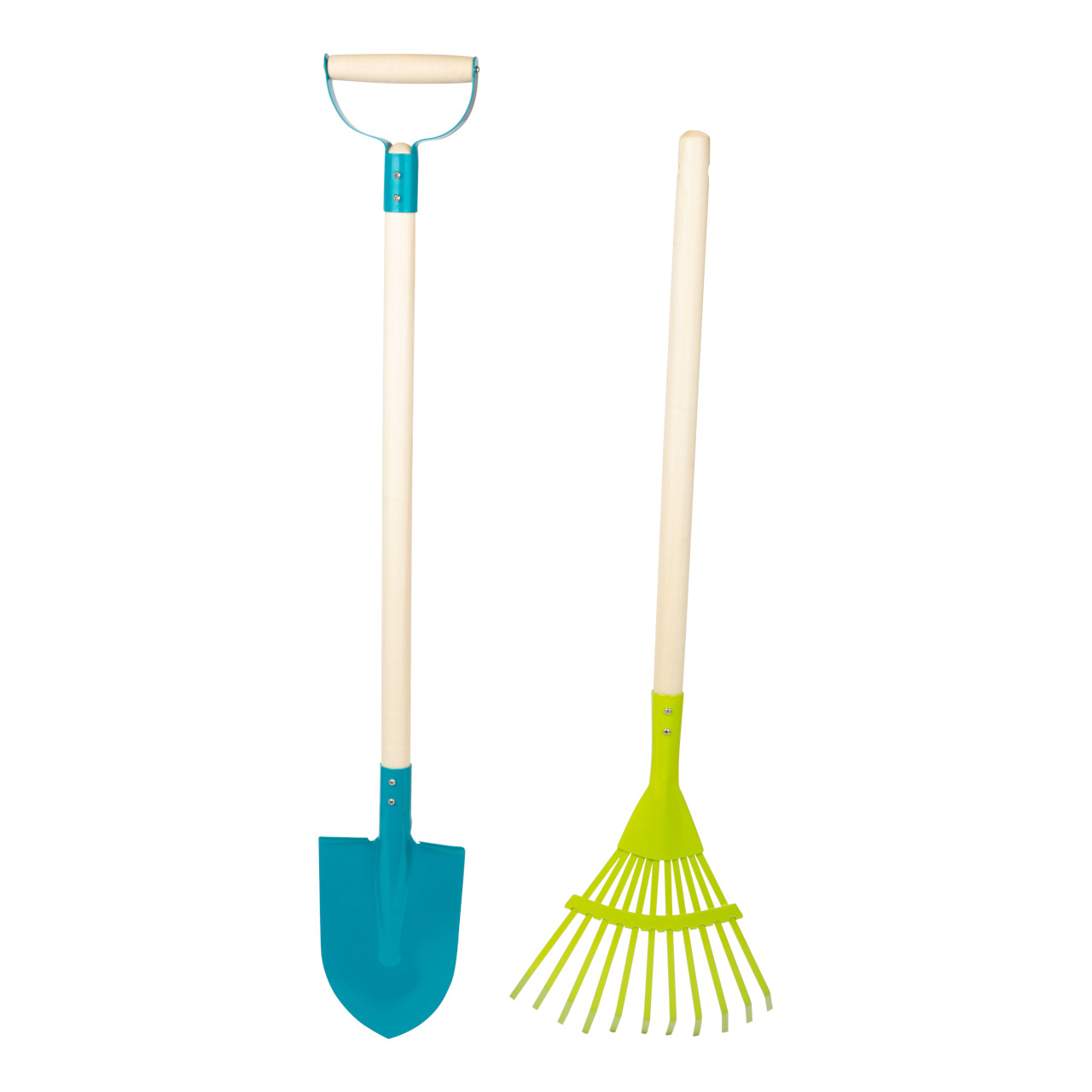 Rozměry: rýč 76x12x3 cm, hrábě 72x21x5 cm Věk: 3+ Materiál: kov, dřevo Sada obsahuje 2 ks
