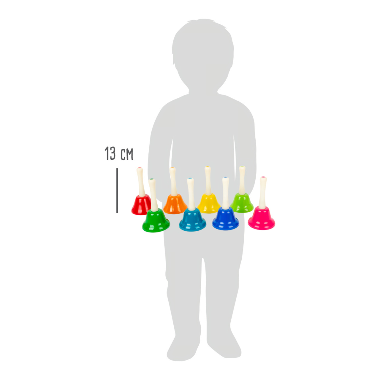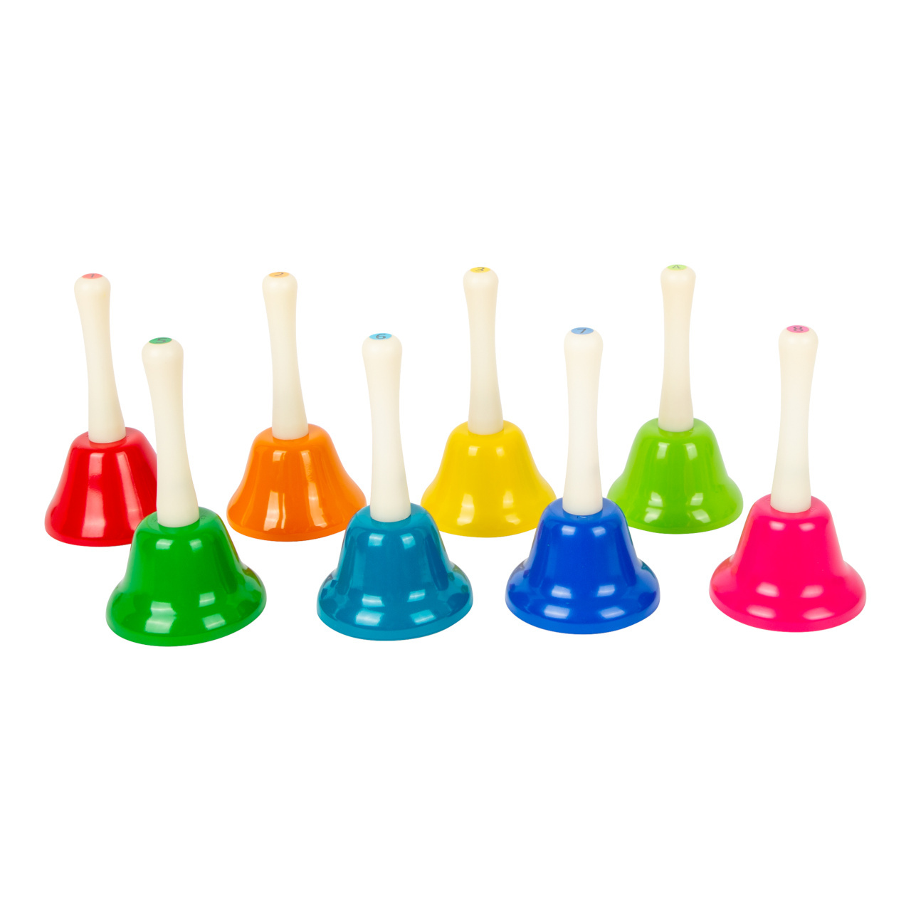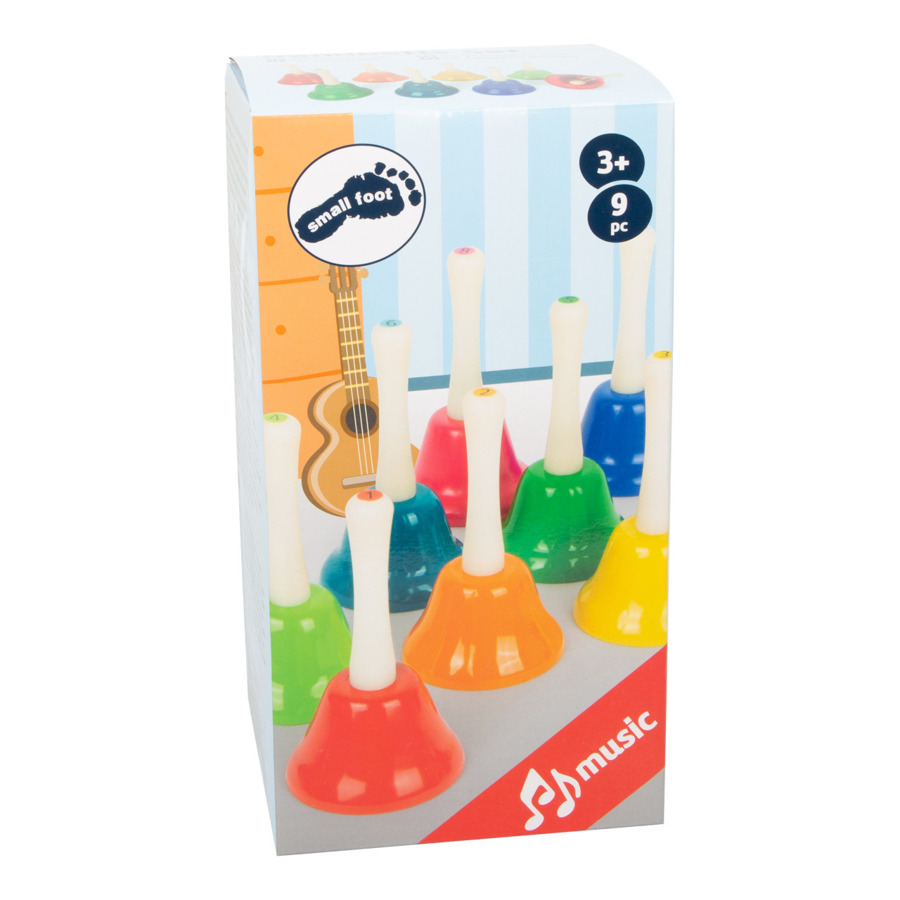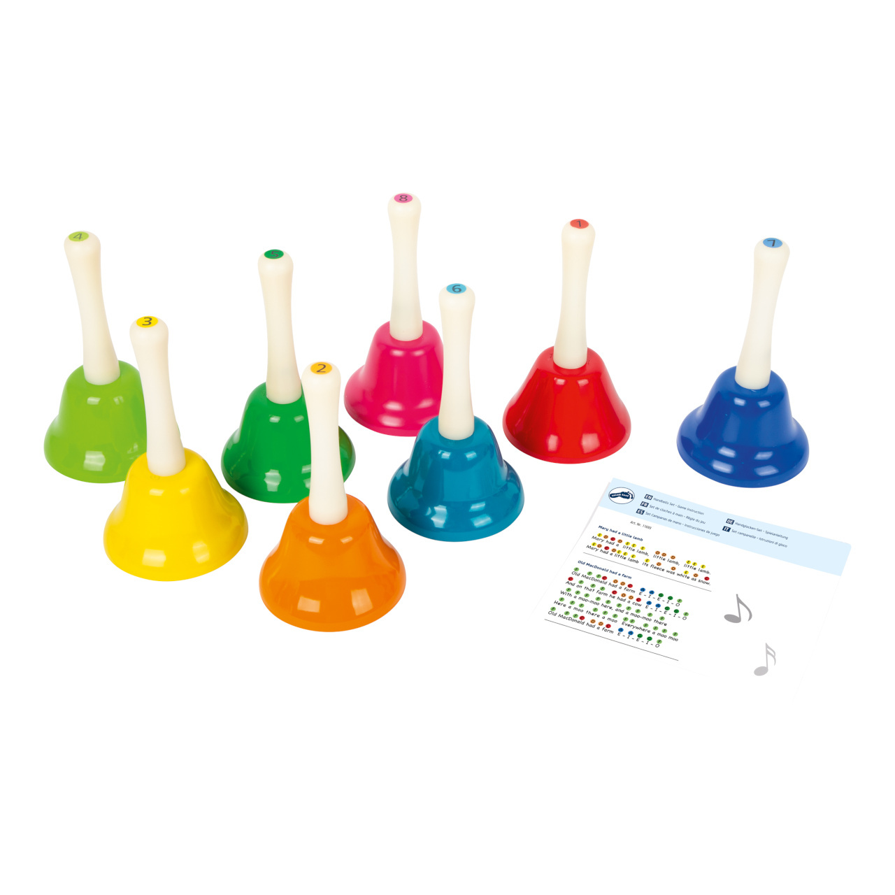 Toto je něco pro vaše uši! Těchto osm zvonečků nerozlišuje jen barva, ale také zvuk. Každý z nich je naladěn na jinou notu – C, D, E, F, G, A, H, C. V balení naleznete také noty s různými skladbami pro začátečníky a malé děti – noty jsou zaznačeny i barevně. Hudební set podporuje u dětí rozvoj rytmu, hudebního sluchu a také koordinace ruka-oko. V notách najdete písničky jako „Strýček Donald farmu měl“, „Rolničky“, „Třpyť se, hvězdičko“. Perfektní také do školek, prvních stupňů základních škol.