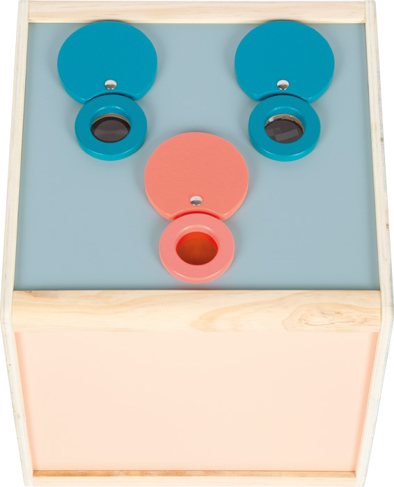 Zbystřete své smysly hravou formou. Tento prostorný senzorický a hmatový box z produktové řady "Sensory" se dvěma bočními otvory nabízí řadu možností pro objevování předmětů různými způsoby - dotykem, viděním, čichem a sluchem. Hračka byla navržená pro podporu rozvoje smyslů a motorických dovedností. Je vhodná i pro ergoterapeutické účely. Lupa, fazetová čočka a červená čočka umožňují nový pohled na předměty, které mají být prozkoumány uvnitř boxu. Tři dřevěné čočky lze snadno vyjmout. Otvory na horní straně lze pak použít k prohlížení, očichávání a poslouchání. Úhlem otevření zadních dvířek a horních výklopných klapek lze regulovat množství světla, které do boxu proniká. Dřevěný box lze plnit různými předměty přes zadní dvířka s magnetickou západkou. Látkové návleky na bočních otvorech zakrývají pohled dovnitř boxu a zároveň zajišťují příjemně měkký přístup. Velikostí jsou vhodné pro děti i dospělé. Vysoce kvalitní a zajímavý smyslový box v moderních barvách slibuje všestrannou a dlouhotrvající zábavu. Ať už se hraje jako paměťová hra, nebo jako hra na hledání, nebo jako hra na rozpoznávání – je to zajímavá, hmatová a smyslová hra, kterou lze hrát samostatně nebo s více hráči, pro ještě větší vzrušující zábavu. Rukávníky jsou připevněny pomocí suchých zipů, díky čemuž jsou odnímatelné, takže je lze prát v ruce na nízkou teplotu.