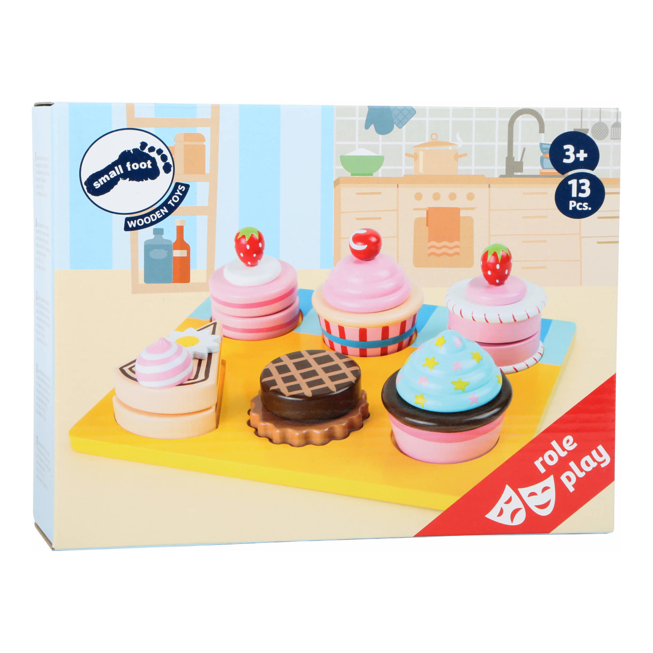Nebraňte se a nabídněte si, s těmito sladkostmi neztloustnete! Souprava maket rozmanitých zákusků pro všechny mlsné jazýčky. Jejich pomocí lze zpestřit hry na hostitele podávající občerstvení váženým návštěvám, nebo na prodavačky a prodavače, různé stánky a obchody. Prostřednictvím těchto her si mohou děti osvojit způsobné společenské chování či pravidla servisu, a rozvíjet tak cenné komunikační dovednosti. Každý zákusek je sestaven ze dvou dílů spojených suchým zipem, které lze mezi sebou kombinovat. Děti tak mohou dát volný průchod své fantazii i při přípravě. Všechny součásti jsou vyrobeny z odolného dřeva a dekorovány pestrými nezávadnými barvami.
