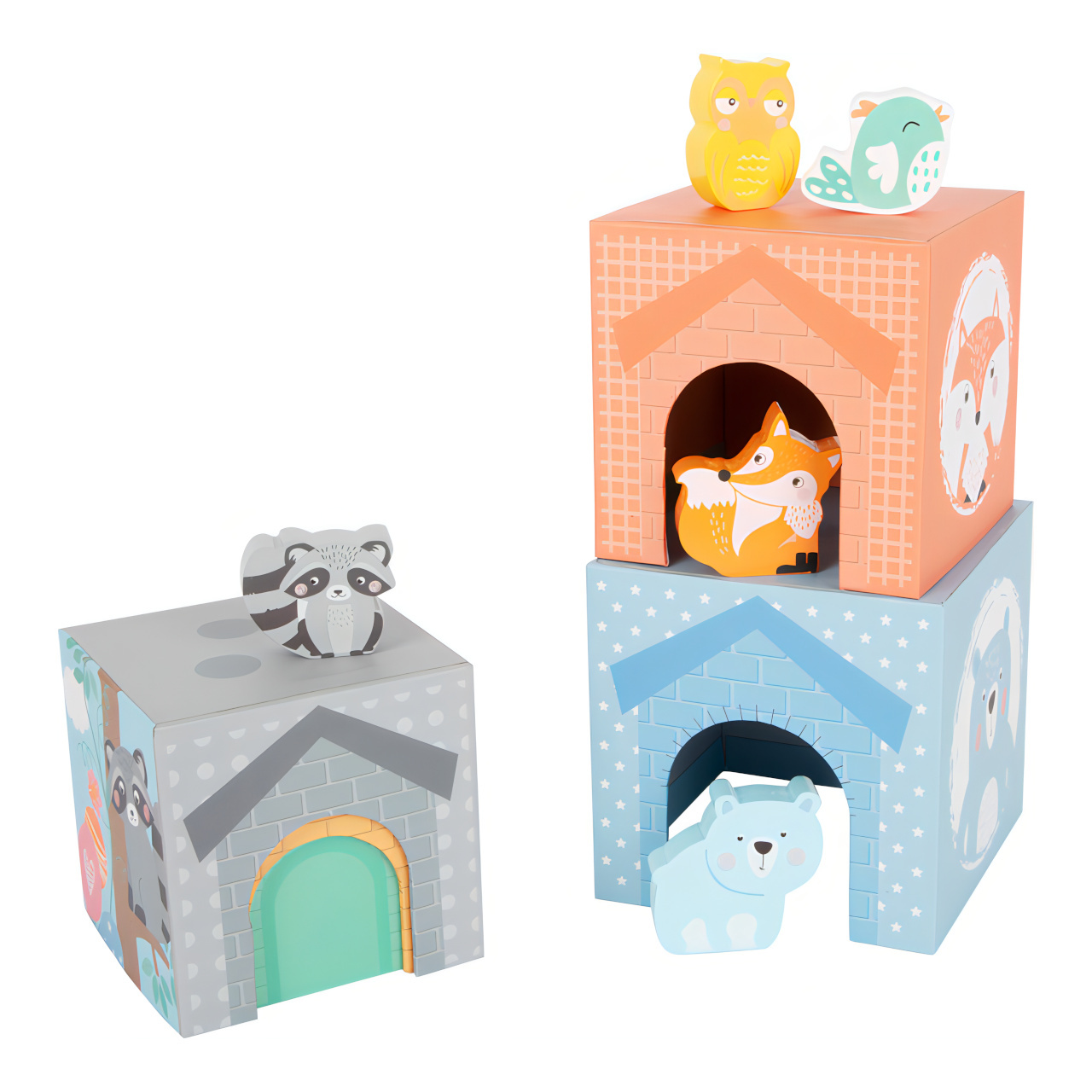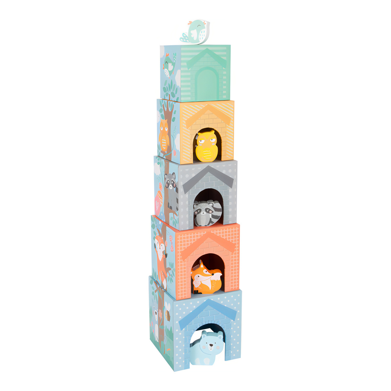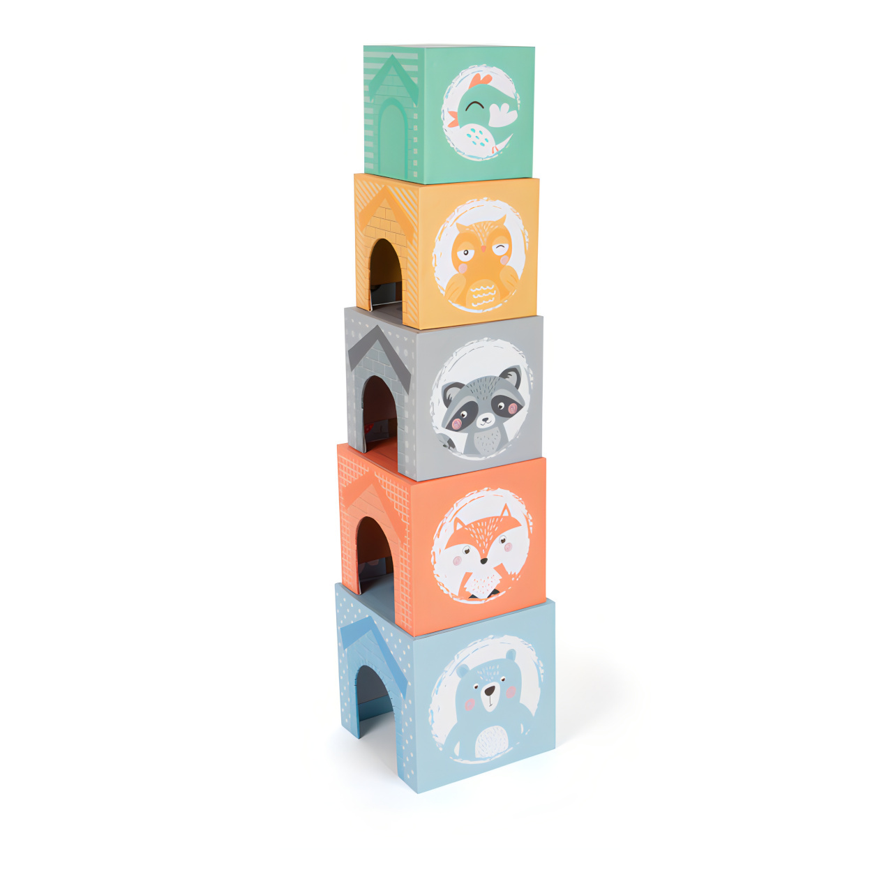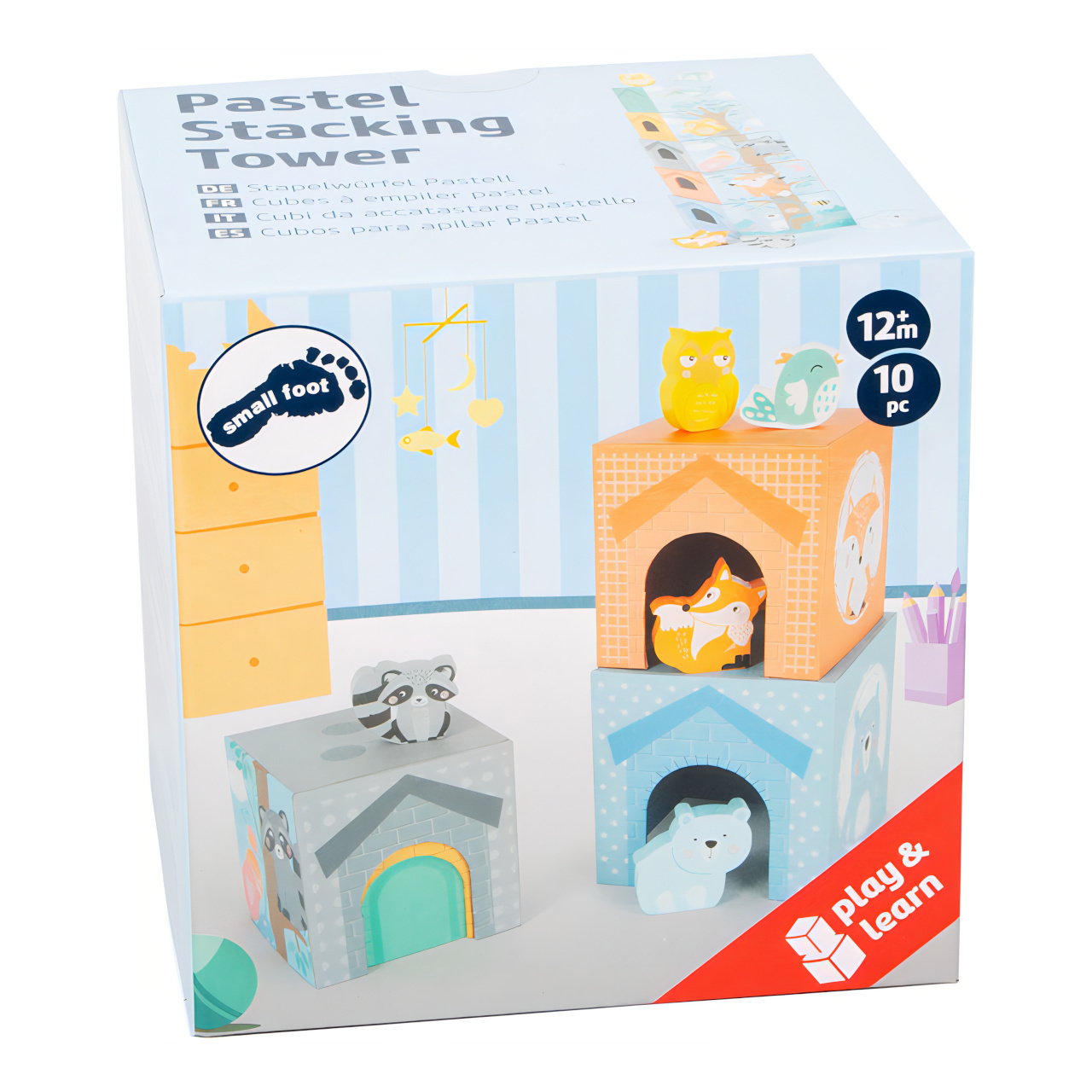 Skládaní je zábava! Pět kostek v trendy pastelových barvách, které mají také ilustraci zvířátek. Jen čekají, až je začnete skládat na sebe! Čtyři z kostek mají okýnko a dveře, ve kterých se mohou schovat postavičky zvířátek. Díky ilustraci na jedné ze stran děti poznají, jak by měly kostky správně složit. Skládání a třídění dětem pomůže rozvinout porozumění barvám a tvarům, také procvičí jejich motoriku. Kdo poskládá kostky ve správném pořadí? Všechny ilustrace jsou detailní a vhodné pro děti. Skládací věž je součástí produktové řady „Pastel“ a zaujme vysokým viditelným podílem dřeva a moderním zabarvením v pastelových barvách.